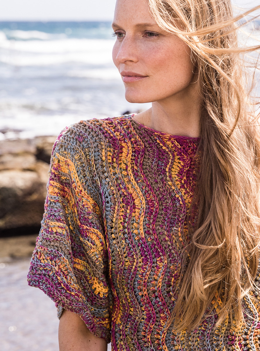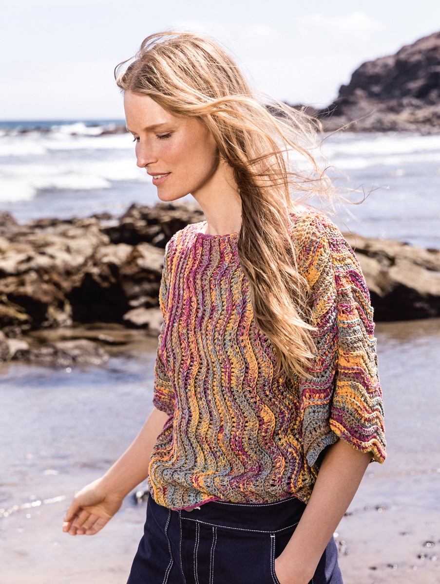 600 (650) g of Lana Grossa A Mano (100% organic cotton; 110 m/50 g) in Yellow/Apricot/Mint/Cyclamen/ Taupe (col 16). Size 4.5 mm crochet hook