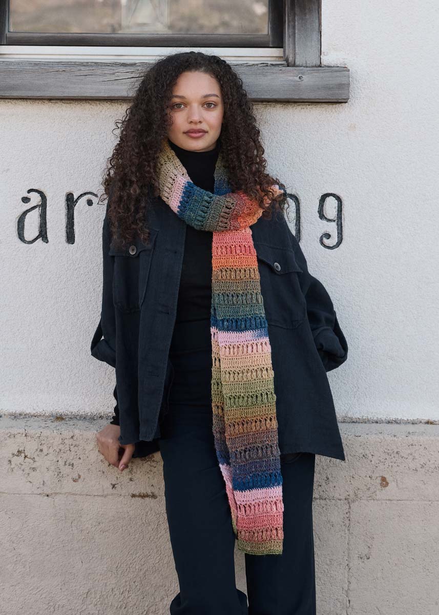 200 g of Lana Grossa Gomitolo Fumo (50% pure wool, 50% acrylic; 700 m/200 g) in Pale Pink/Apricot/Orange/ Yellow/Green Grey/Ochre/Petrol (col 515). Size 5 mm crochet hook.