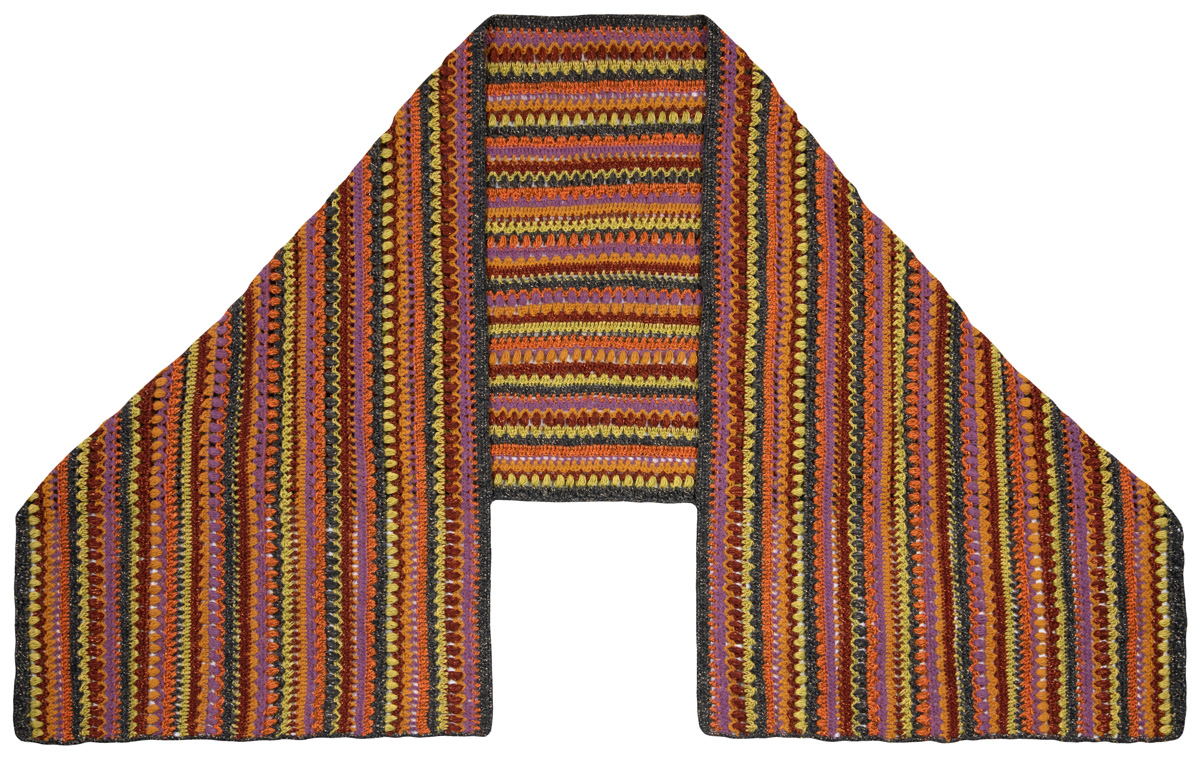 50 g each of Lana Grossa Ecopuno (72% cotton, 17% Merino wool, 11% baby alpaca; 215 m/50 g) in Dark Grey (col 15), Jaffa Orange (col 5), Berry (col 40), Yellow Orange (col 33), Brown Red (col 31) and Yellow Green (col 3); 25 g each of Lana Grossa Brillino (83% viscose, 17% metallic fiber; 200 m/25 g) in Camel/Gold (col 4), Red Gold (col 2) and Copper Red (col 1). Size 3.5 and 2.5 mm crochet hook