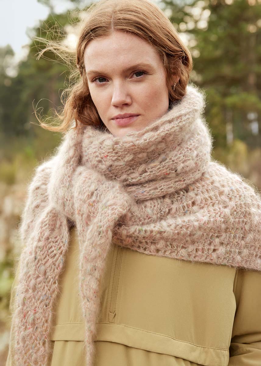 125 g each of Lana Grossa Natural Superkid Tweed (60% superkid mohair, 30% silk, 7% cotton, 3% polyester; 200 m/25 g) in Natural (col 614) and Rosé (col 629). Size 5.5 mm crochet hook.