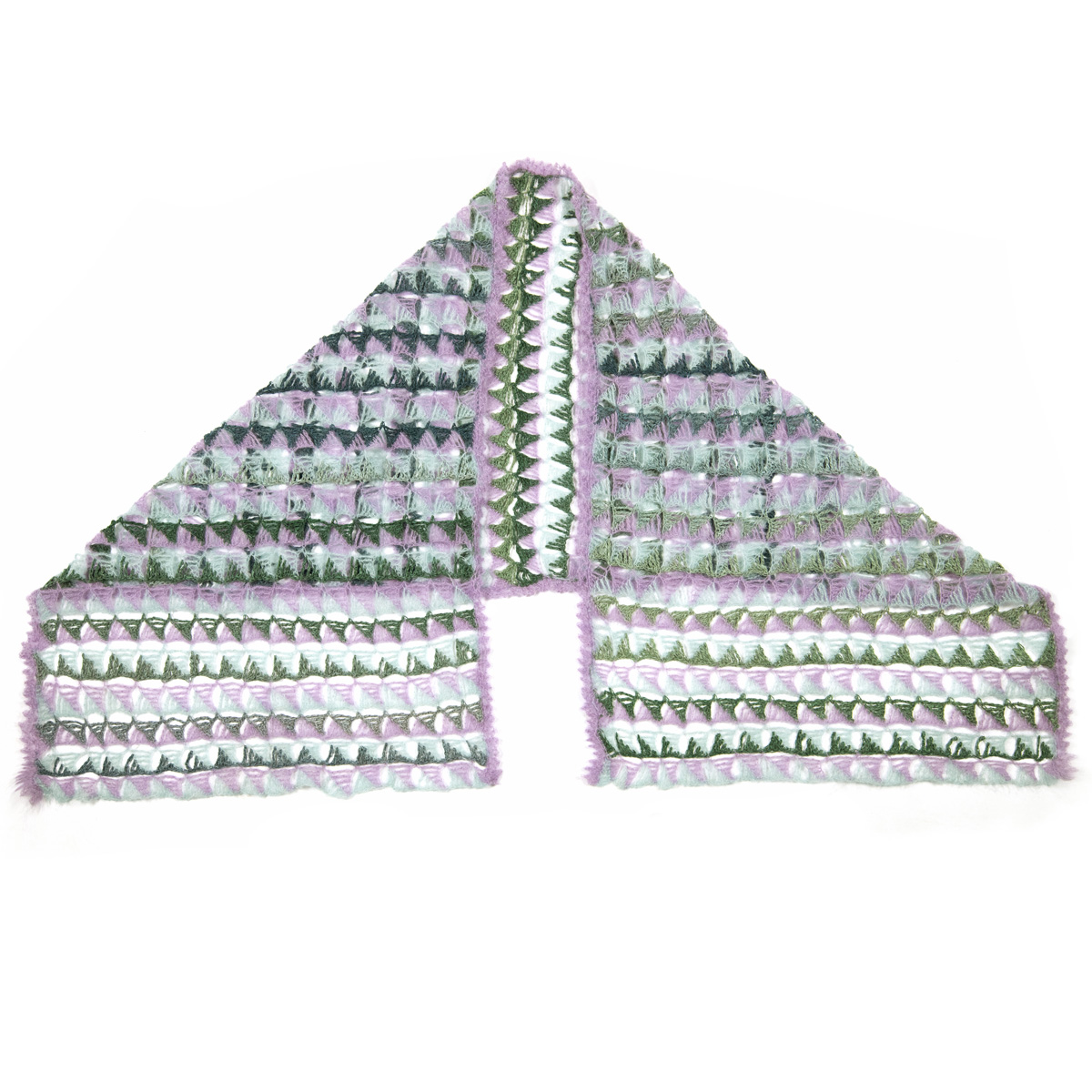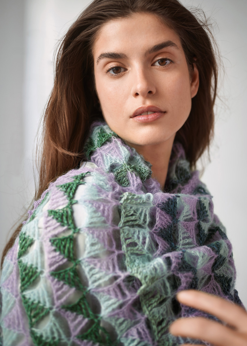 200 g of Lana Grossa Mare (46% linen, 33% silk, 21% cotton; 330 m/100 g) in Light Grey/Grey Blue/Jeans/ Mint/Light Petrol/Reed (col 10); 75 g of Lana Grossa Silkhair (70% superkid mohair, 30% silk; 210 m/25 g) in Lilac (col 173) and 50 g in Mint (col 175). Size 3.5 mm crochet hook