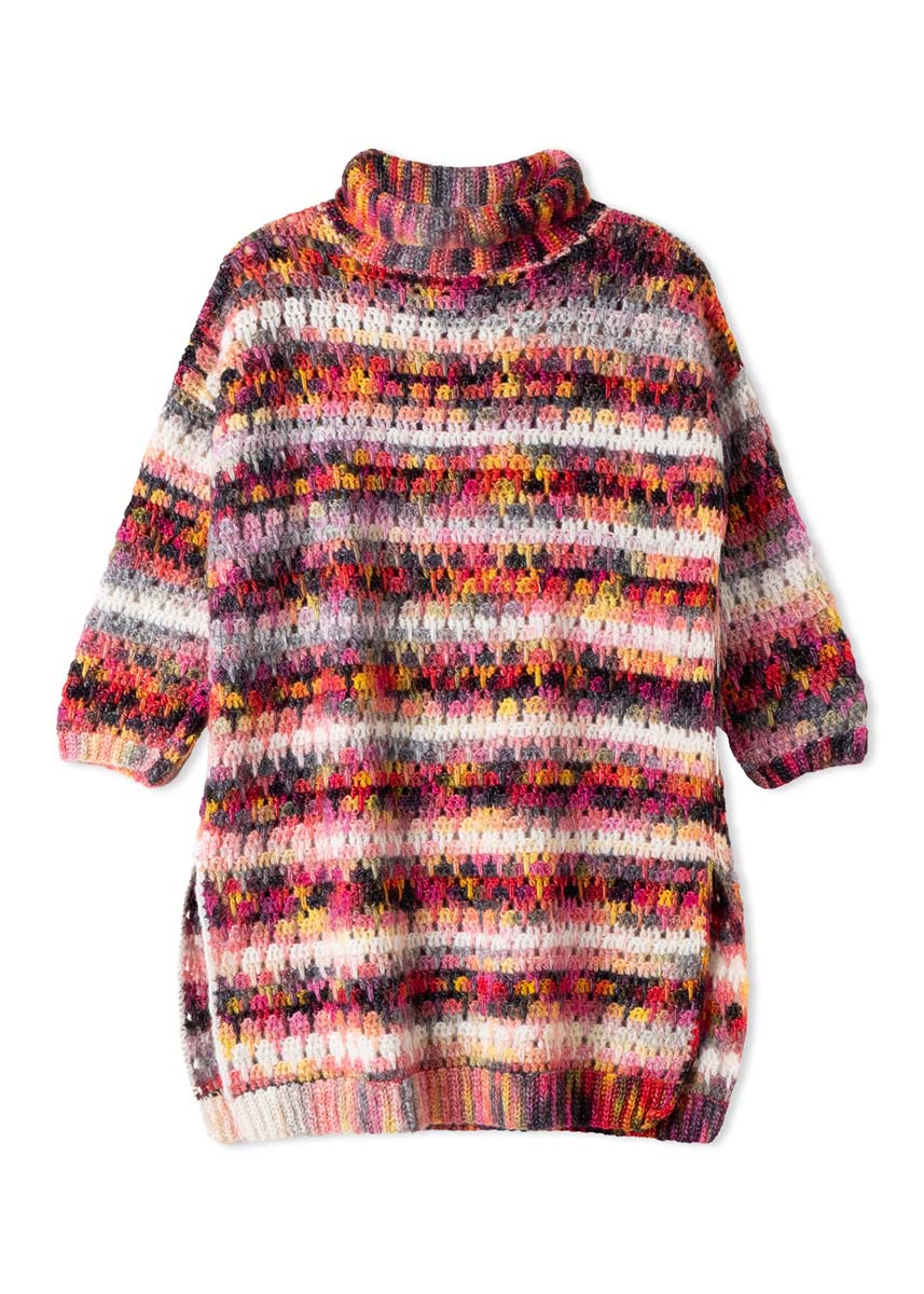 400 (450, 500) g of Lana Grossa Picasso (36% extrafine Merino wool, 36% baby alpaca, 28% polyamide; 210 m/50 g) in Cream/Pink/Antique Pink/Grey Purple/Beige/Charcoal/ Nougat/Wine Red/Plum/Olive/Dark Grey (col 16). Size 4 and 5 mm crochet hook; stitch markers