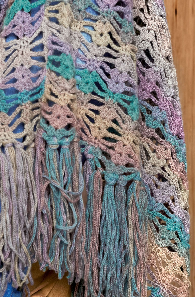 200 (250) g of Lana Grossa Cashmere 16 Fine Degradè (80% extrafine Merino wool, 10% cashmere, 10% polyamide; 320 m/50 g) in Purple/Beige/Turquoise (col 101). Size 4 mm crochet hook