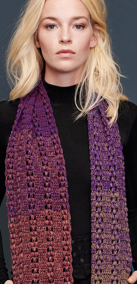 200 g of Lana Grossa Shades of Alpaca Silk (45% pure wool, 35% baby alpaca, 20% silk; 680 m/200 g) in Grey-Brown/Khaki/Red Violet/Dark Red/Clay Red (col 313). Size 4 mm crochet hook