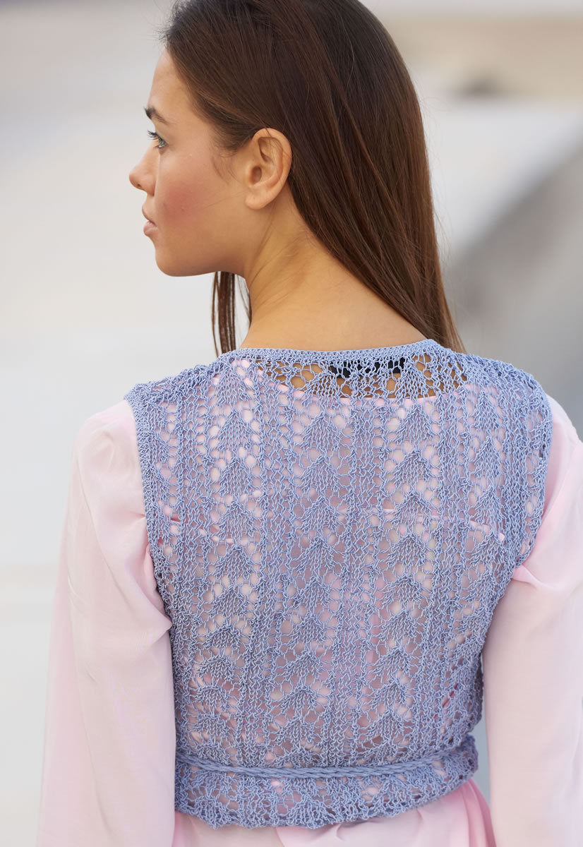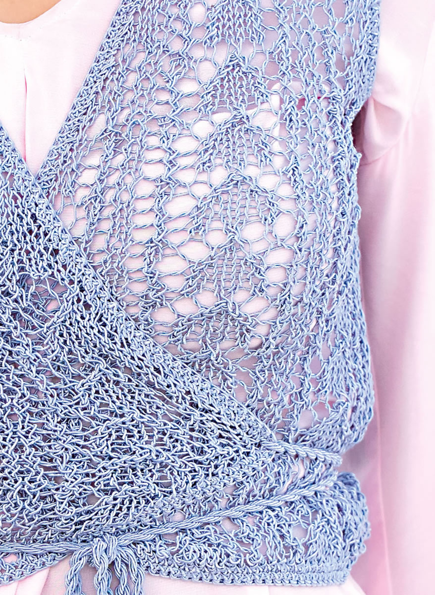 200 g of Lana Grossa Secondo (55% cotton, 25% polyamide; 125 m/50 g) in Dove Blue (col 82). Size 4 mm needles; size 3 mm crochet hook.