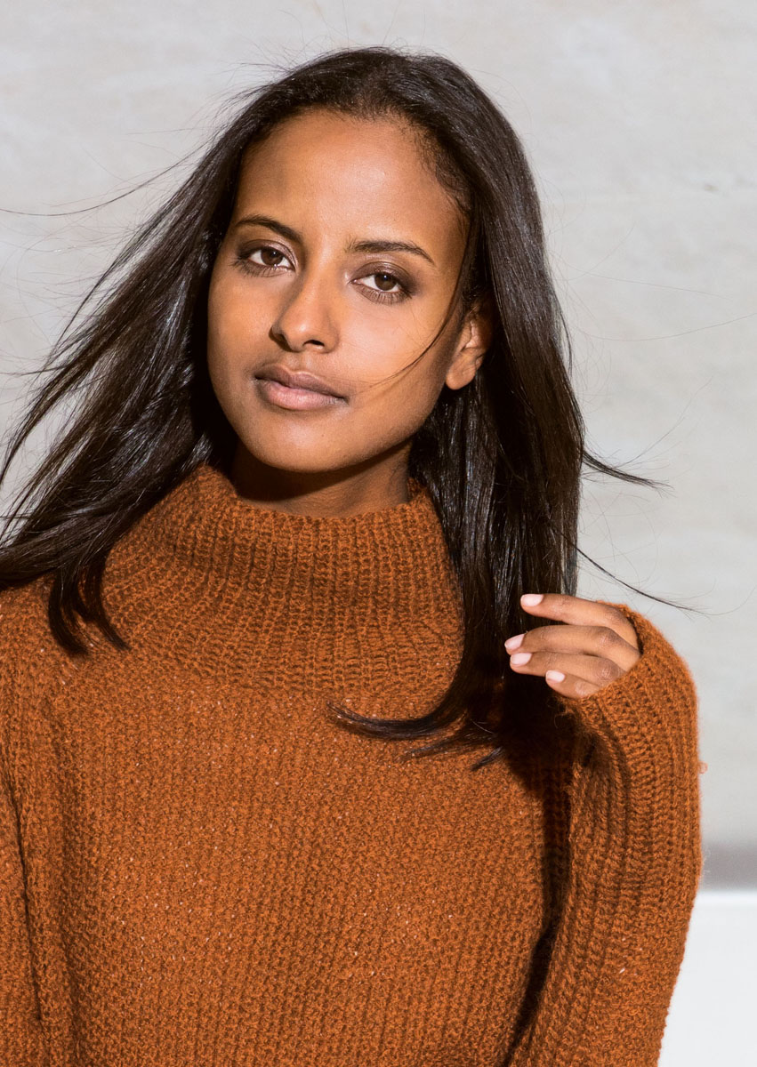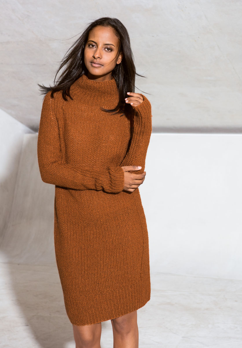 300 (350, 400) g of Lana Grossa Arioso (48% pure wool, 30% alpaca, 22% polyamide; 240 m/50 g) in Terracotta (col 22). Size 6 and 7 mm needles; size 6 mm circular needle, 40 cm long