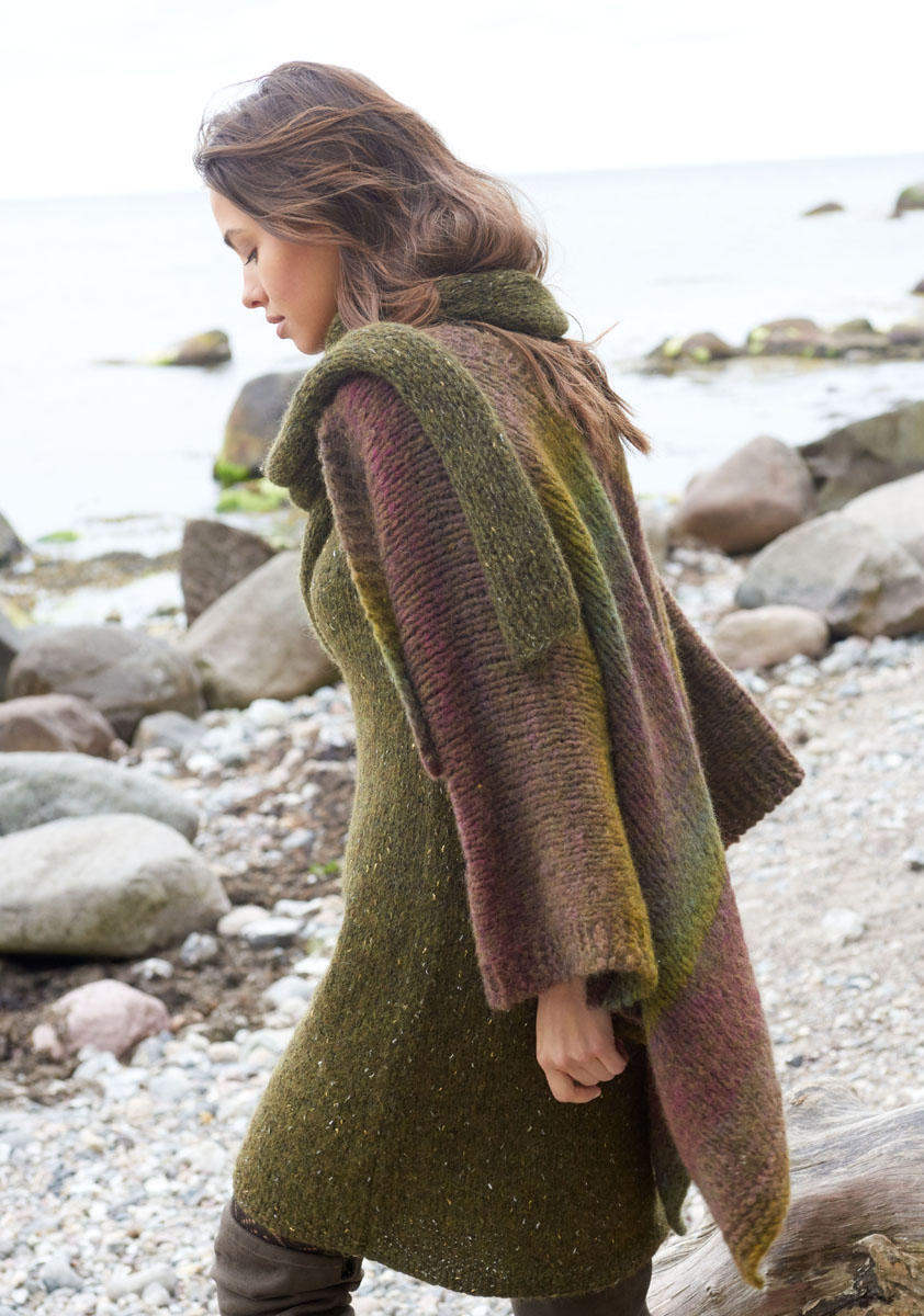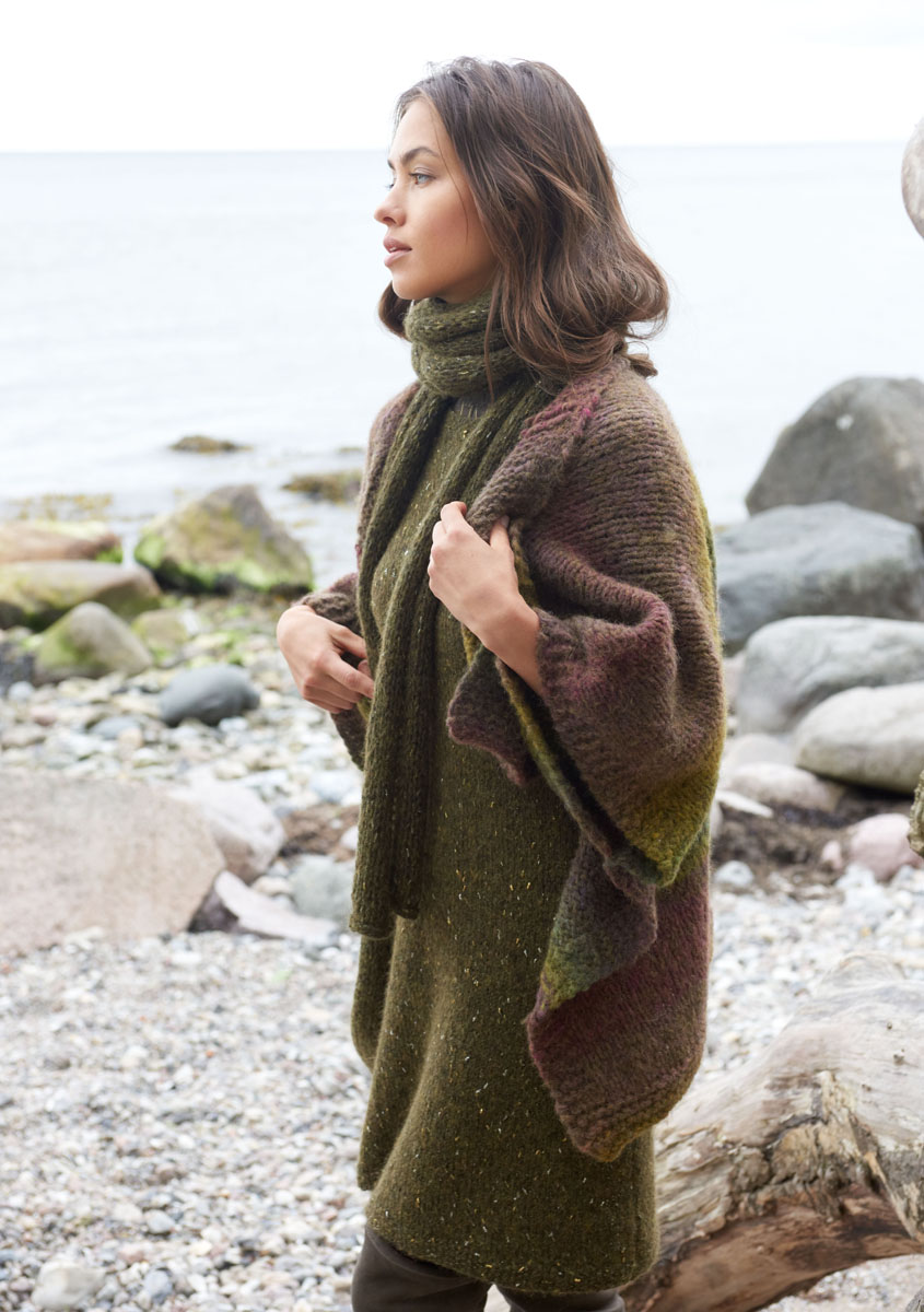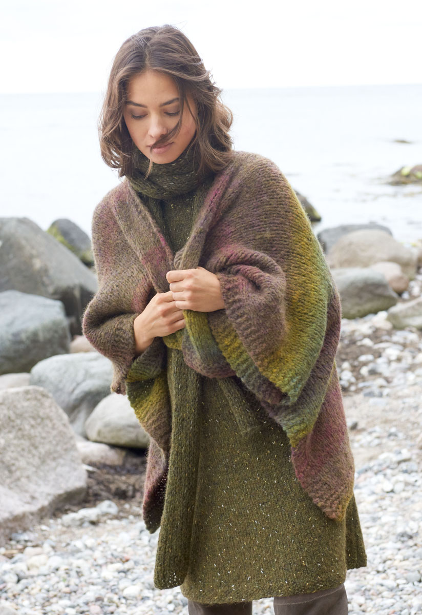 400 (450) g of Lana Grossa Cometa (34% baby alpaca, 33% polyamide, 22% viscose, 6% Merino wool, 5% polyester; 130 m/50 g) in Khaki/Gold/Silver (col 13). Size 5.5 mm needles; size 5.5 mm circular needle, 50 cm long