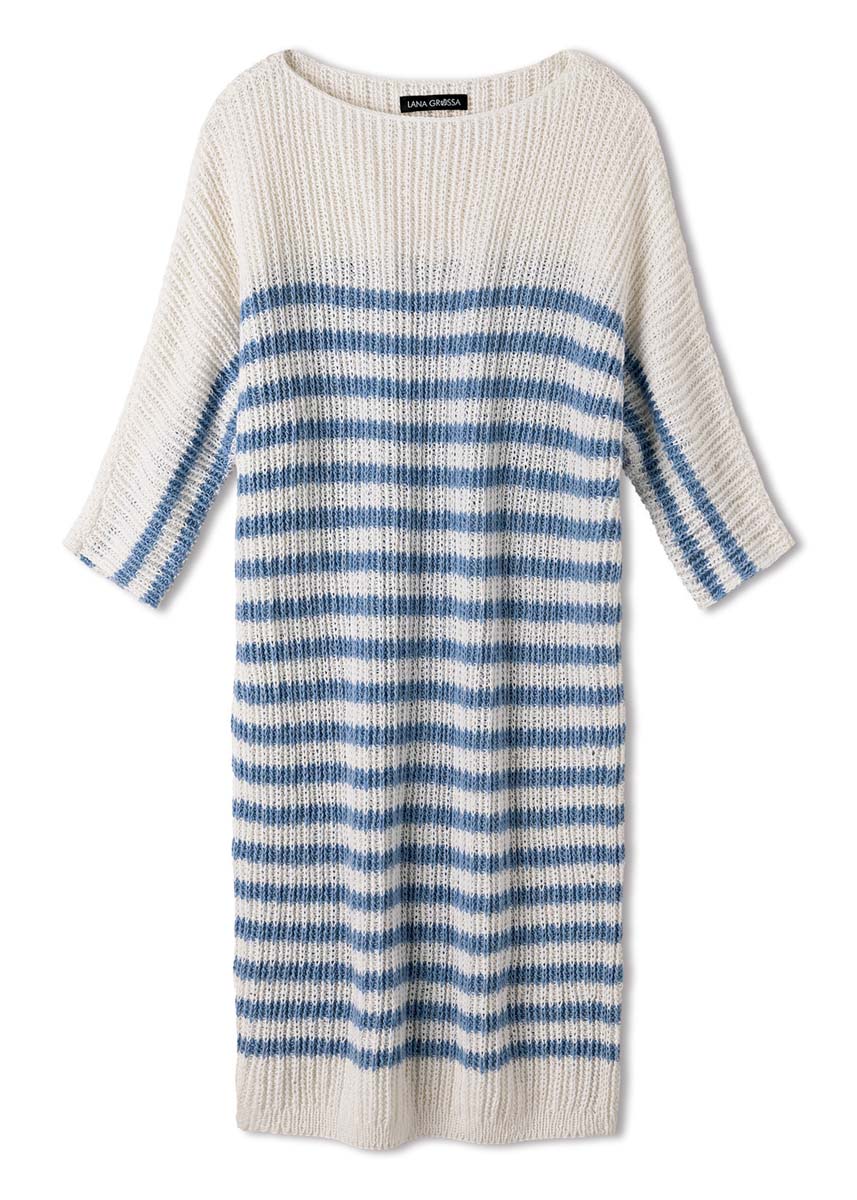 350 (400) g of Lana Grossa Ecopuno (72% cotton, 17% Merino wool, 11% baby alpaca; 215 m/50 g) in White (col 26) and 200 (250) g in Light Blue (col 13). Size 3 and 4 mm needles; size 4 mm circular needle, 100 cm long; size 3.5 mm crochet hook.