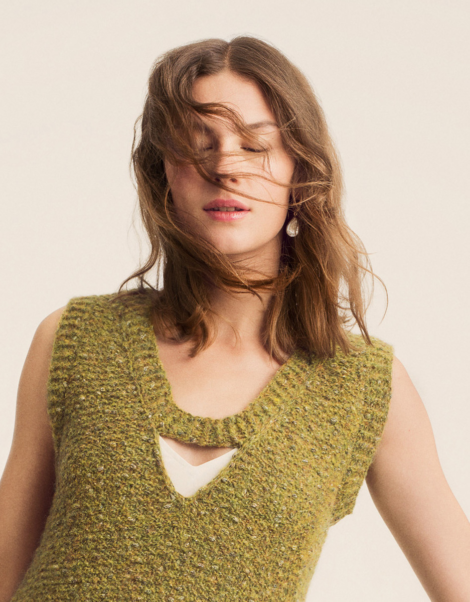 350 (400) g of Lana Grossa Lala Berlin Fluffy (42% pure wool, 18% mohair, 19% alpaca, 21% polyamide; 130 m/50 g) in Mustard Mélange (col 123). Size 6 mm circular needle, 60 cm long