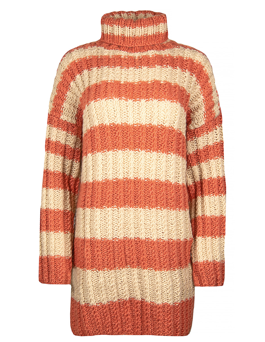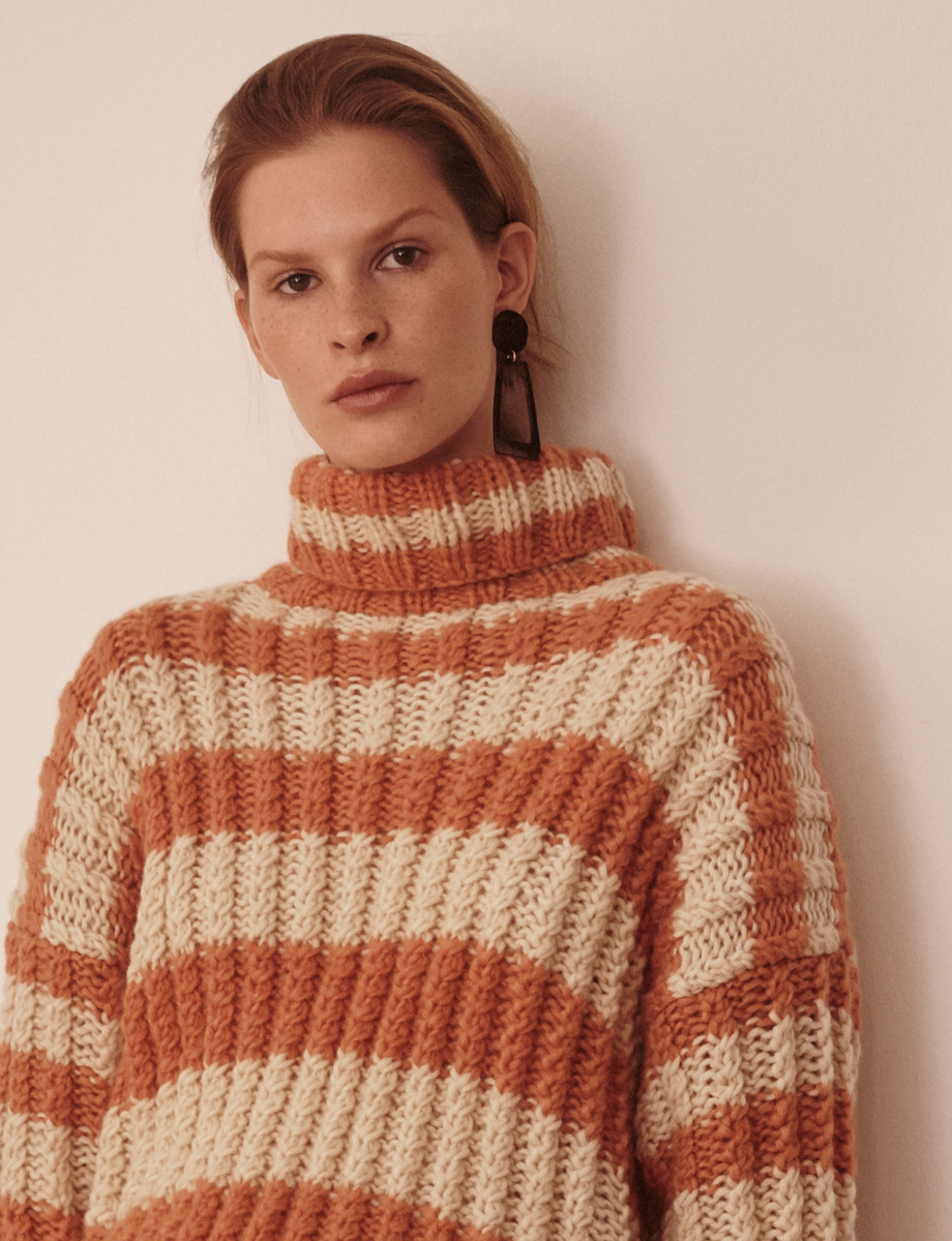325 (350) g of Lana Grossa Lala Berlin Lovely Cashmere (60% cashmere, 25% polyamide, 15% Merino wool; 60 m/25 g) in Salmon (col 2); 300 (350) g of Lana Grossa Lala Berlin Lovely Cotton (75% superfine Merino wool; 25% cotton; 75 m/50 g) in Natural (col 7). Size 8 mm needles; size 7 mm circular needle, 50 cm long