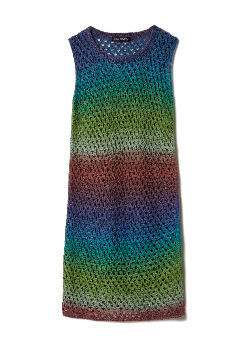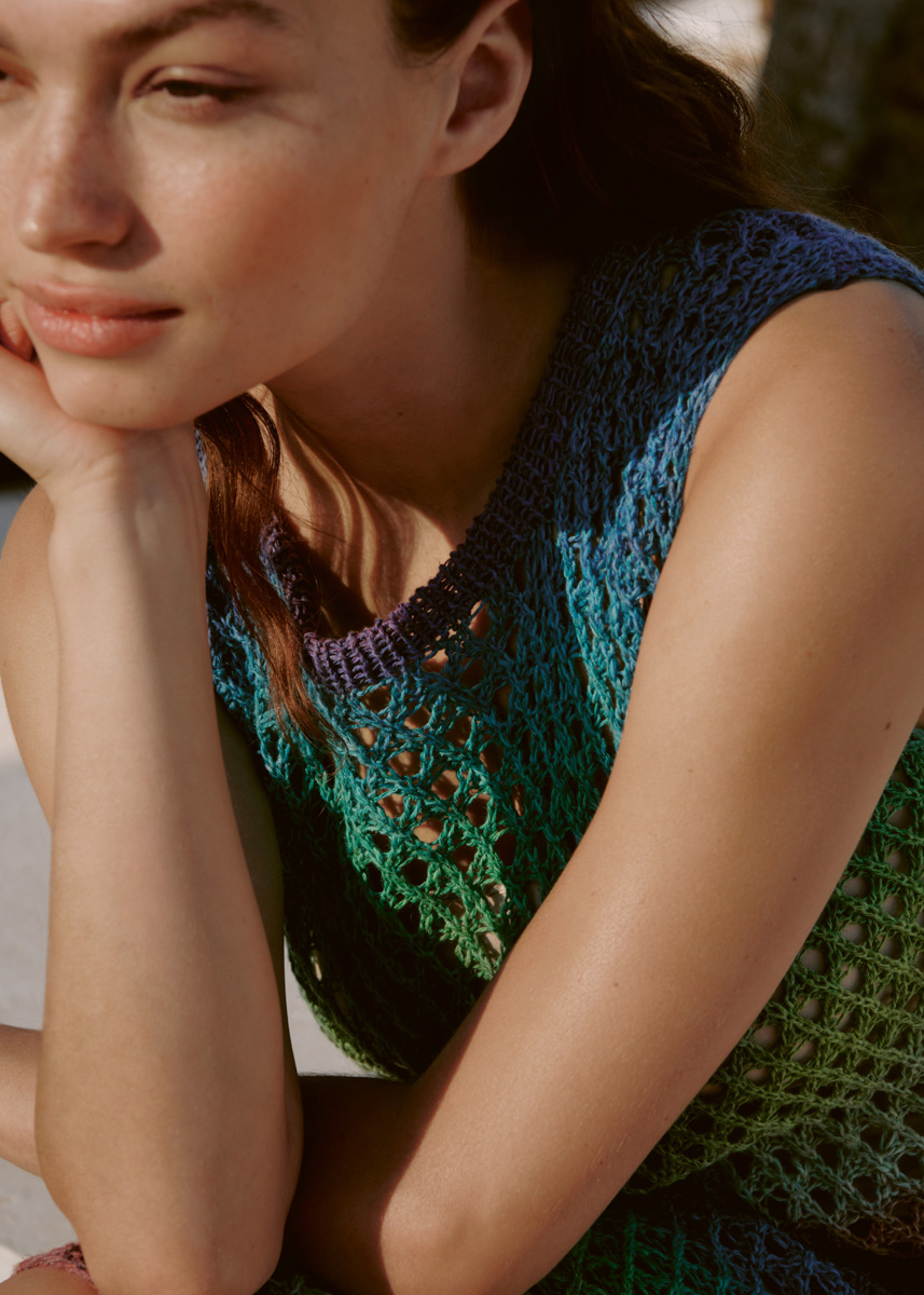 300 (400) g of Lana Grossa Mare (46% linen, 33% silk, 21% cotton; 330 m/100 g) in Mint/Rust/Chestnut/ Blue/Turquoise/Green/Pistachio (col 12). Size 3.5 mm needles; size 3.5 mm circular needle, 50 cm long