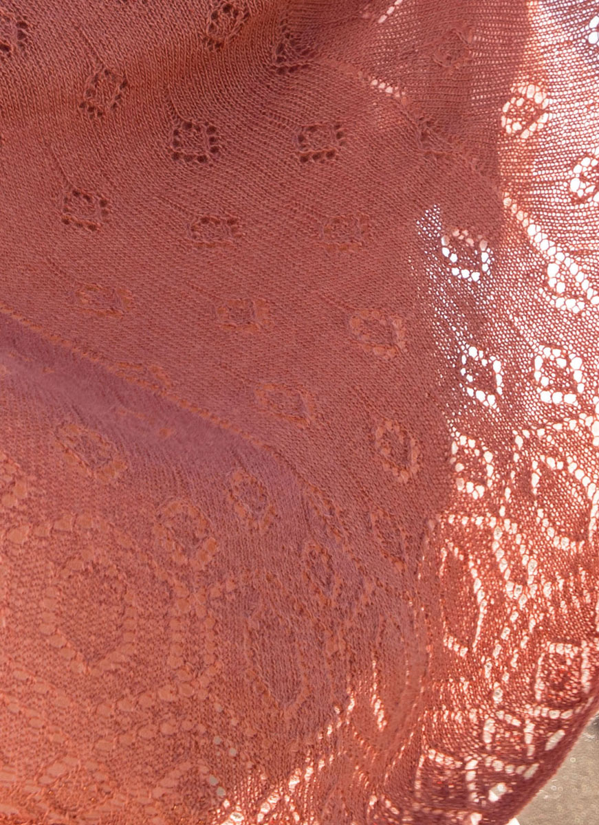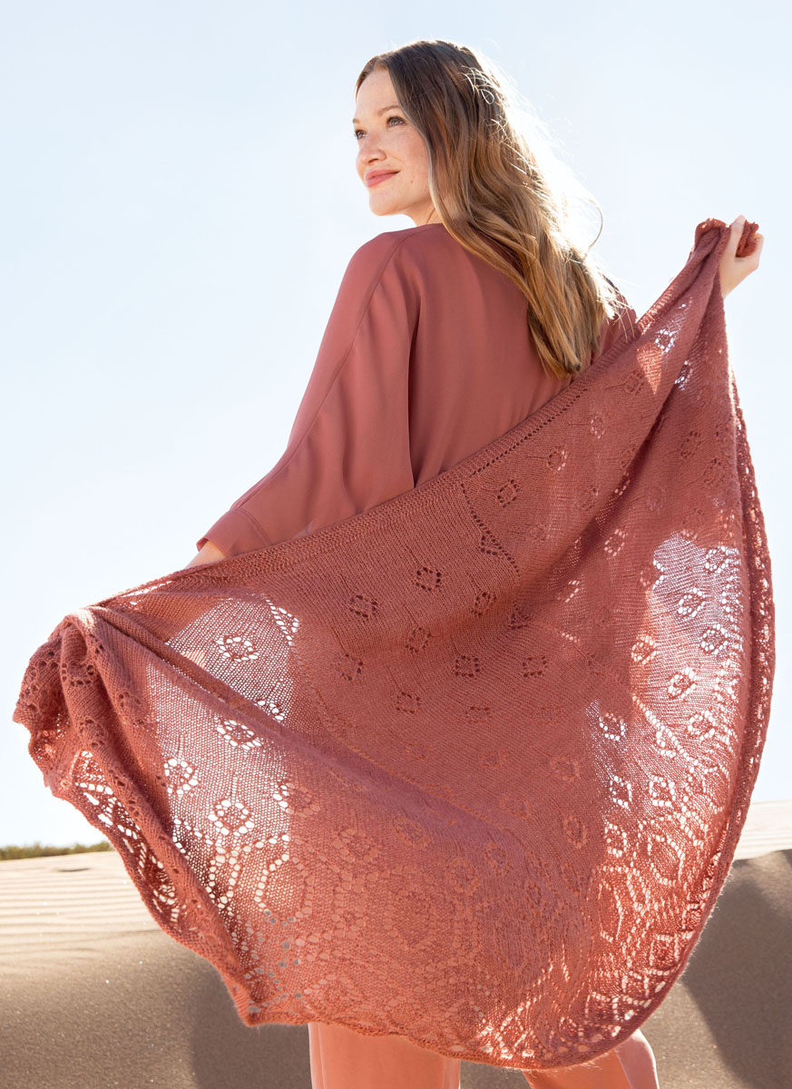 250 g of Lana Grossa Lace Seta (70% alpaca, 30% silk; 250 m/50 g) in Red Clay (col 26). Size 4 mm circular needle; size 3 and 0.75 mm crochet hook; optional: 210 Rocailles beads in matching color, approx. 3 mm in diameter