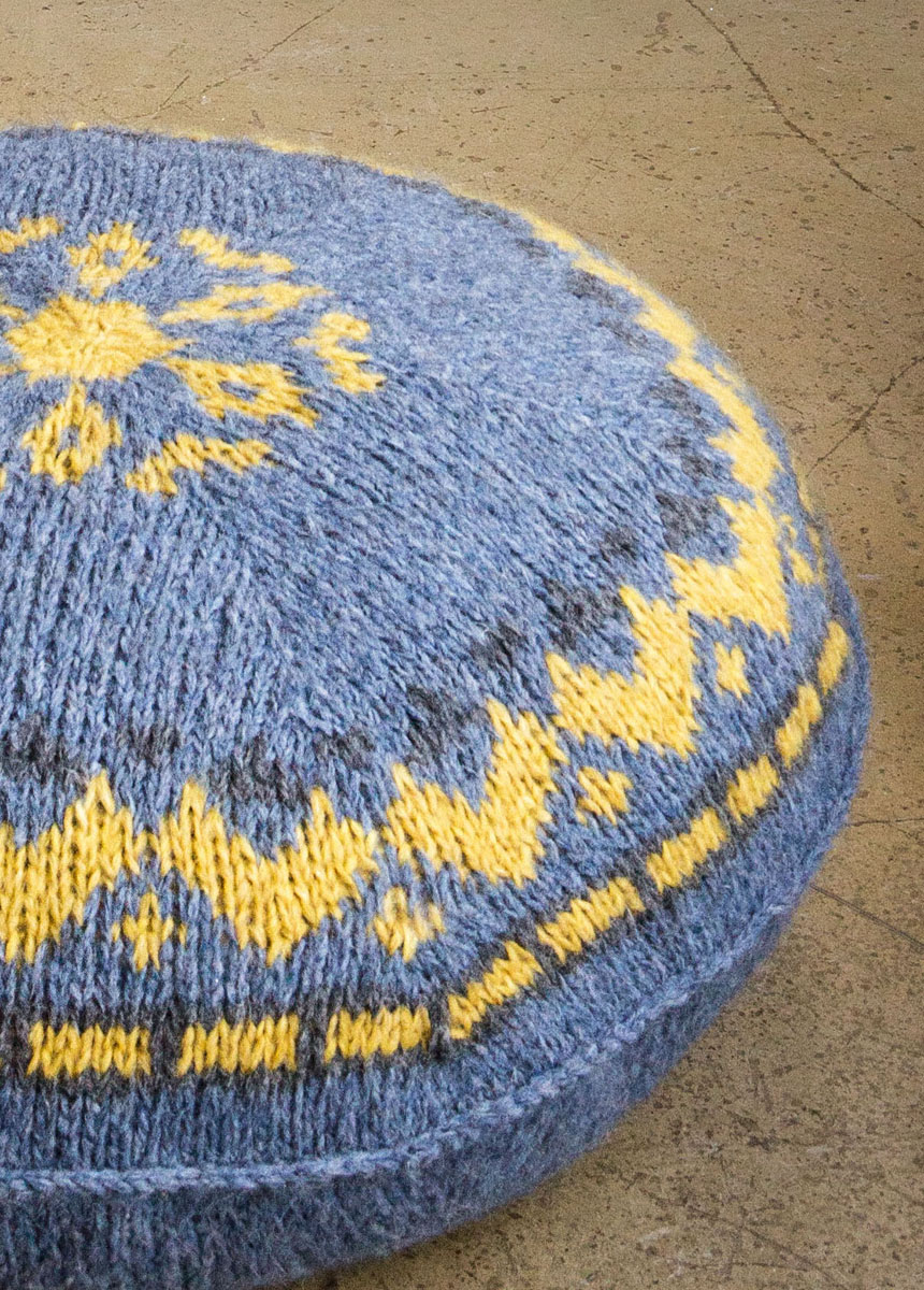 350 g of Lana Grossa Cloud (80% alpaca, 14% Merino wool, 6% polyamide; 80 m/50 g) in Jeans (col 10), 100 g in Honey (col 5) and 50 g in Dark Grey (col 7). One set size 6 mm dpns; size 6 mm circular needles, 40, 80, and 120 cm long; size 6 mm crochet hook; pillow form, 70 cm in diameter