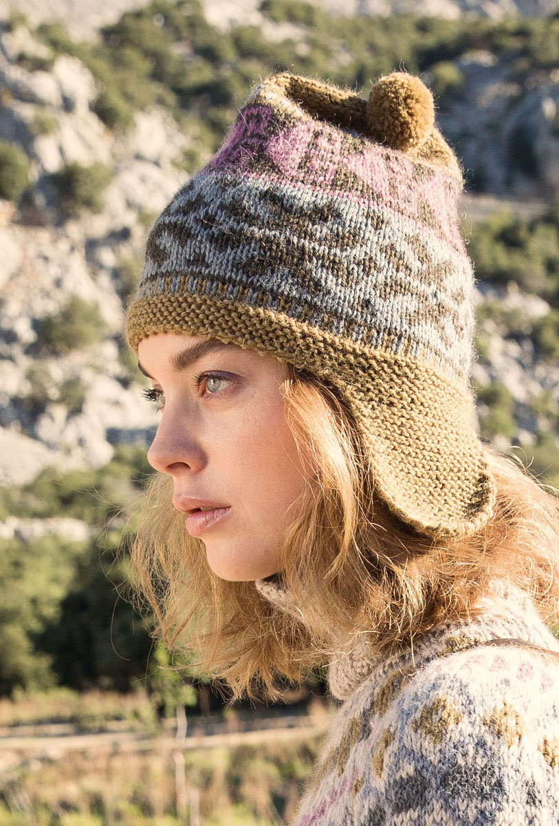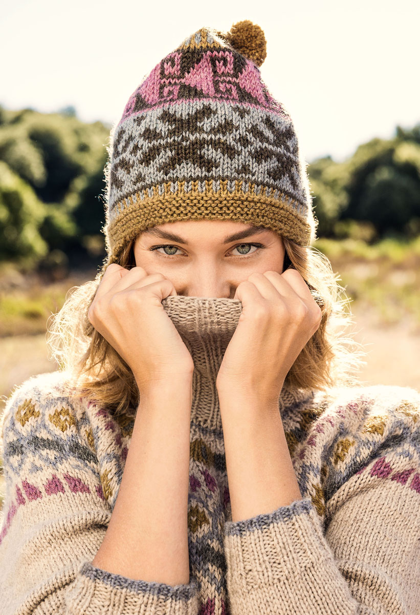50 g each of Lana Grossa Alpaca Peru 100 (100% alpaca; 100 m/50 g) in Olive (col 13), Mud (col 115), Blue-Grey (col 108) and Red-Purple (col 102). One set size 4 mm doublepointed needles [dpns]; size 3.5 mm crochet hook; pompom maker