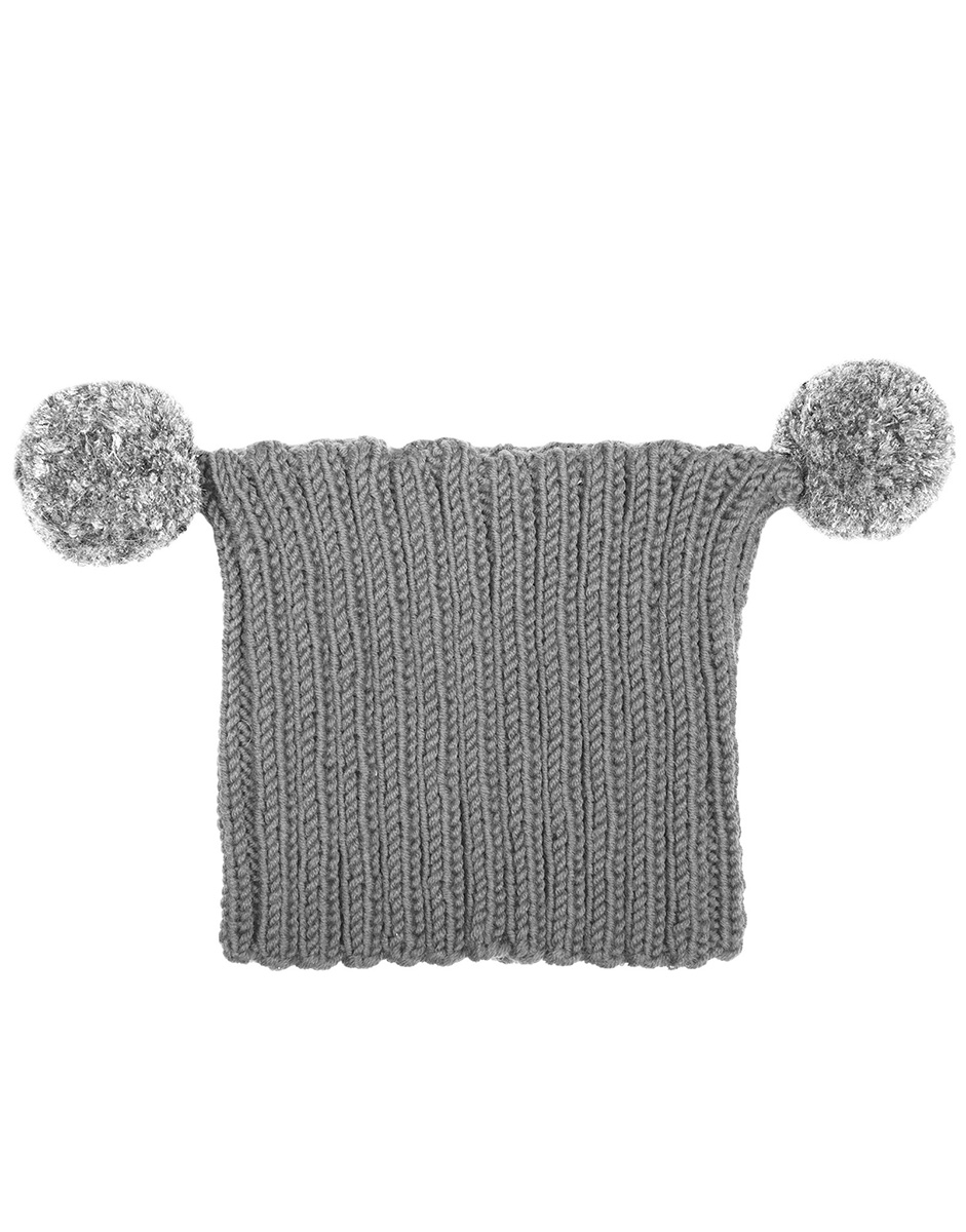 100 (150) g of Lana Grossa Bingo (100% pure wool; 80 m/ 50 g) in Fuchsia (col 169) and 50 g of Lana Grossa Lala Berlin Shiny (46% alpaca, 30% cotton, 8% pure wool, 8% polyamide, 8% polyester; 150 m/50 g) in Grey (col 6). One set each size 4.5 and 5.5 mm double-pointed needles [dpns]; pompom maker by Lana Grossa