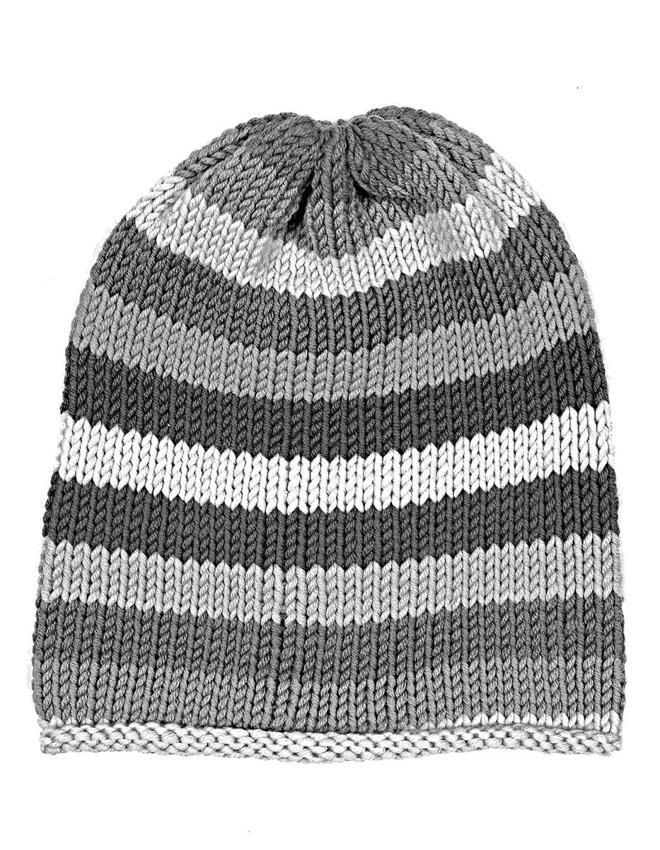50 g each of Lana Grossa Bingo (100% pure wool; 80 m/50 g) in Natural (col 152), Grey/Green (col 196), Purple (col 721), Green/Yellow (col 199), Crimson (col 726), Pale Green (col 176), Cobalt (col 90), Cognac (col 187) and Opal (col 164). One set size 4.5 mm double-pointed needles [dpns]