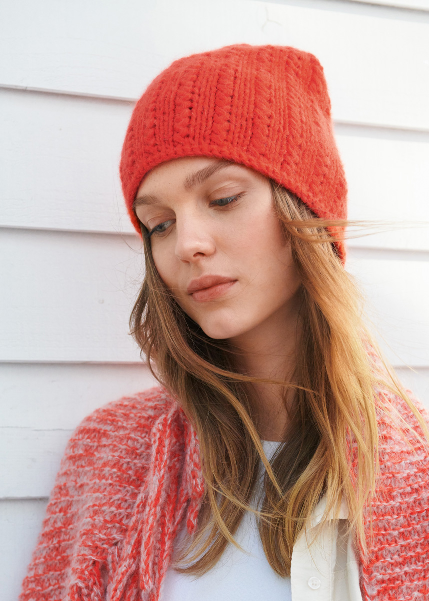 100 g of Lana Grossa Brigitte No. 2 (47% baby alpaca, 45% cotton, 8% Merino wool; 140 m/50 g) in Coral (col 25). One set size 7 mm double-pointed needles [dpns]; size 4 mm crochet hook
