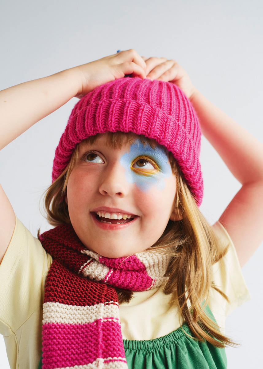 100 g of Lana Grossa Cool Wool (100% pure wool; 160 m/50 g) in Cyclamen (col 537) or Green (col 2017). One set size 3.5 mm double-pointed needles [dpns].