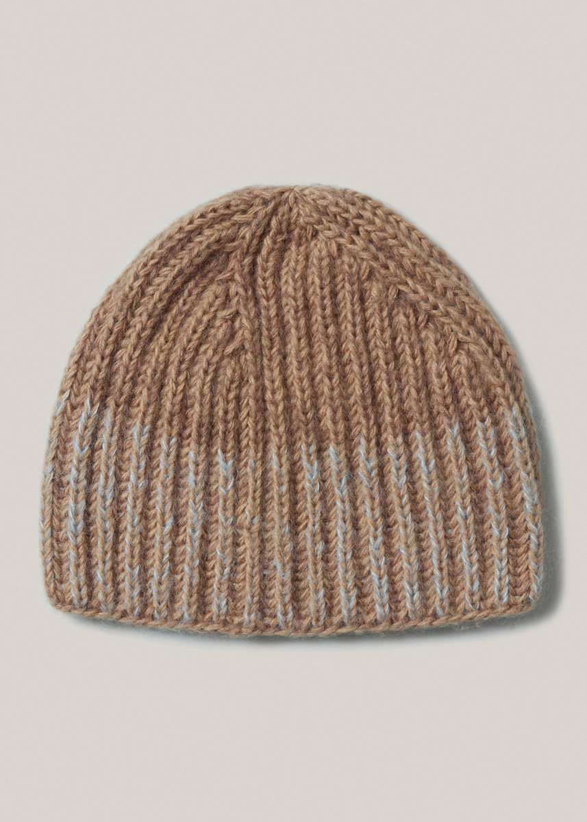 100 g of Lana Grossa Ecopuno (72% cotton, 17% Merino wool, 11% baby alpaca; 215 m/50 g) in Camel (col 32); 25 g each of Lana Grossa Setasuri (69% Suri alpaca, 31% silk; 212 m/25 g) in Nougat (col 4) and Light Blue (col 14). Size 3.5 mm circular needle, 50 cm long; one set size 3.5 mm double-pointed needles [dpns]; tapestry needle.