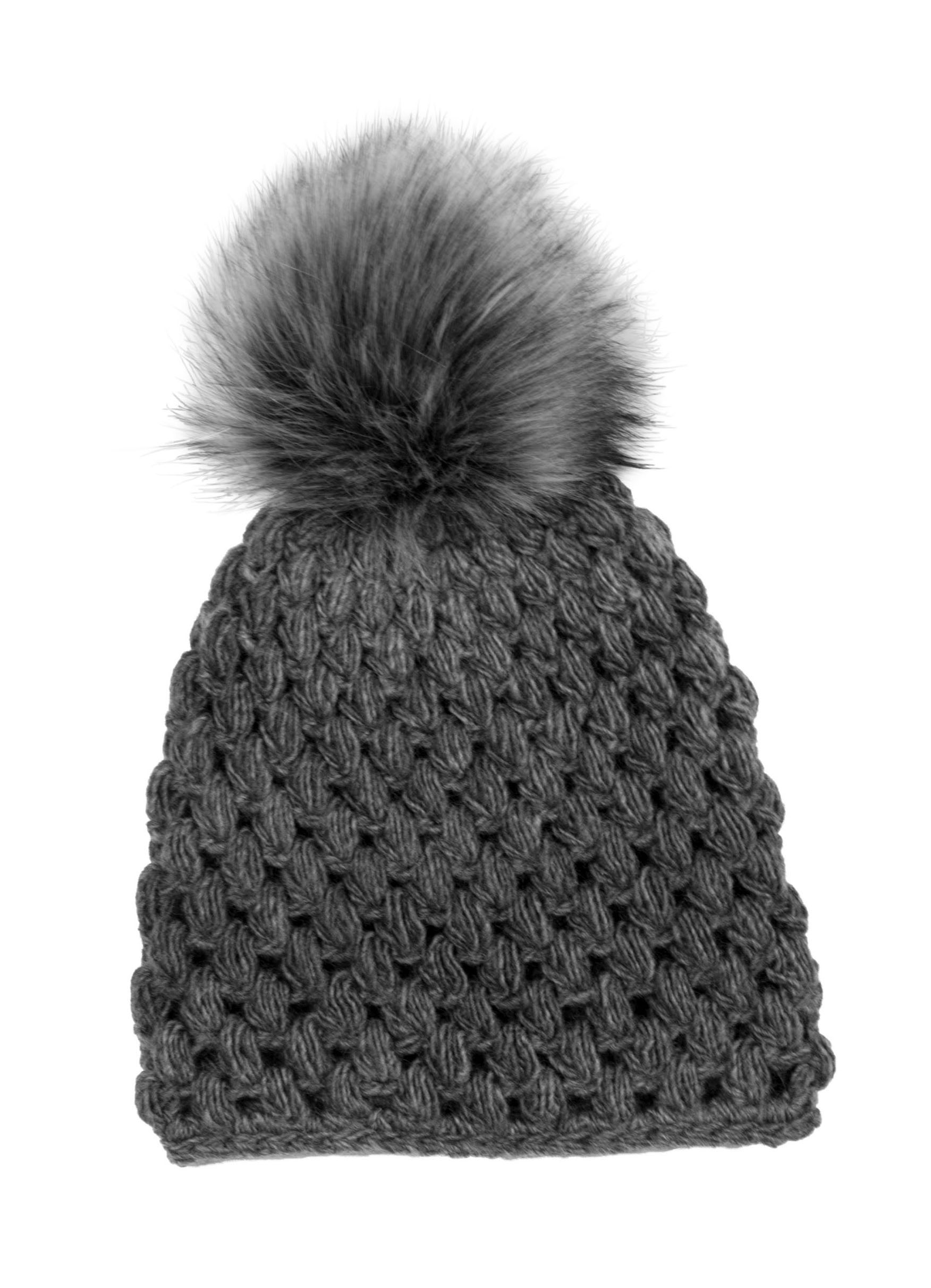 200 g of Lana Grossa Gomitolo 200 Dégradé (50% pure wool, 50% acrylic; 700 m/200 g) in Taupe/Brown (col 304). Size 5 mm crochet hook; 1 faux fur pompom/Lang [item 9809907, col 258]