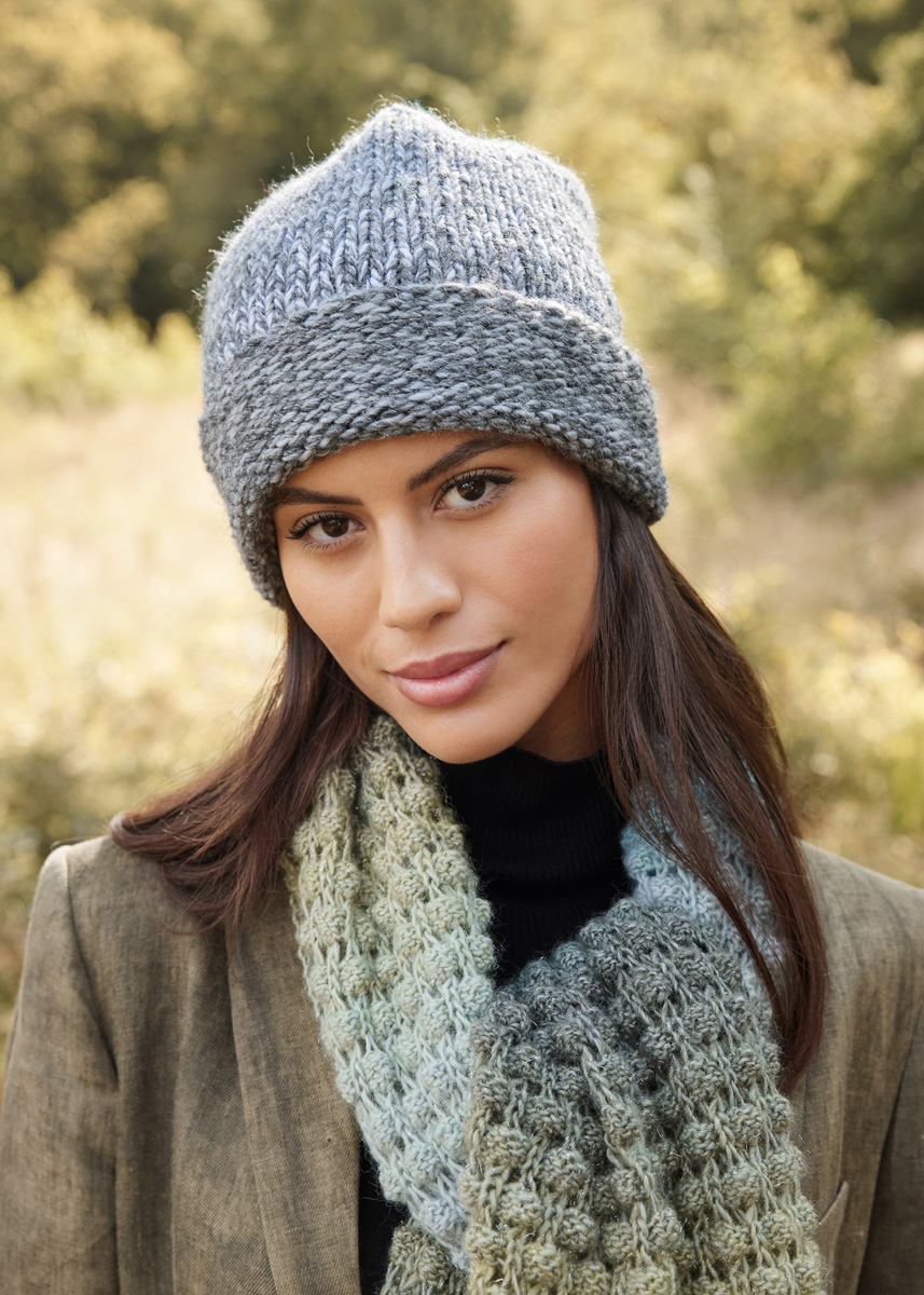 200 g of Lana Grossa Gomitolo Gala (60% pure wool, 38% acrylic, 2% polyester; 700 m/200 g) in Light Grey/ Medium Grey/Dark Grey (col 4023). Short size 7 mm circular needle or one set size 7 mm double-pointed needles [dpns].