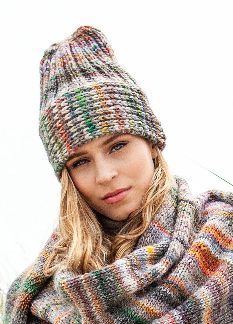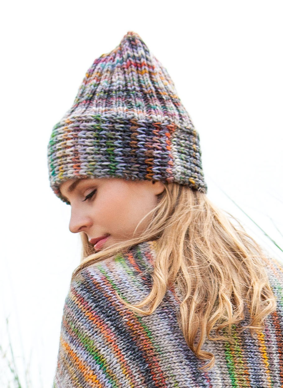 100 g of Lana Grossa Gomitolo Mezzo (50% pure wool, 50% acrylic; 90 m/50 g) in Taupe/Antique Pink/Yellow-Green/Orange/Salmon/Turquoise-Blue/Purple/Coral (col 103). One set size 5.5 mm double-pointed needles [dpns]