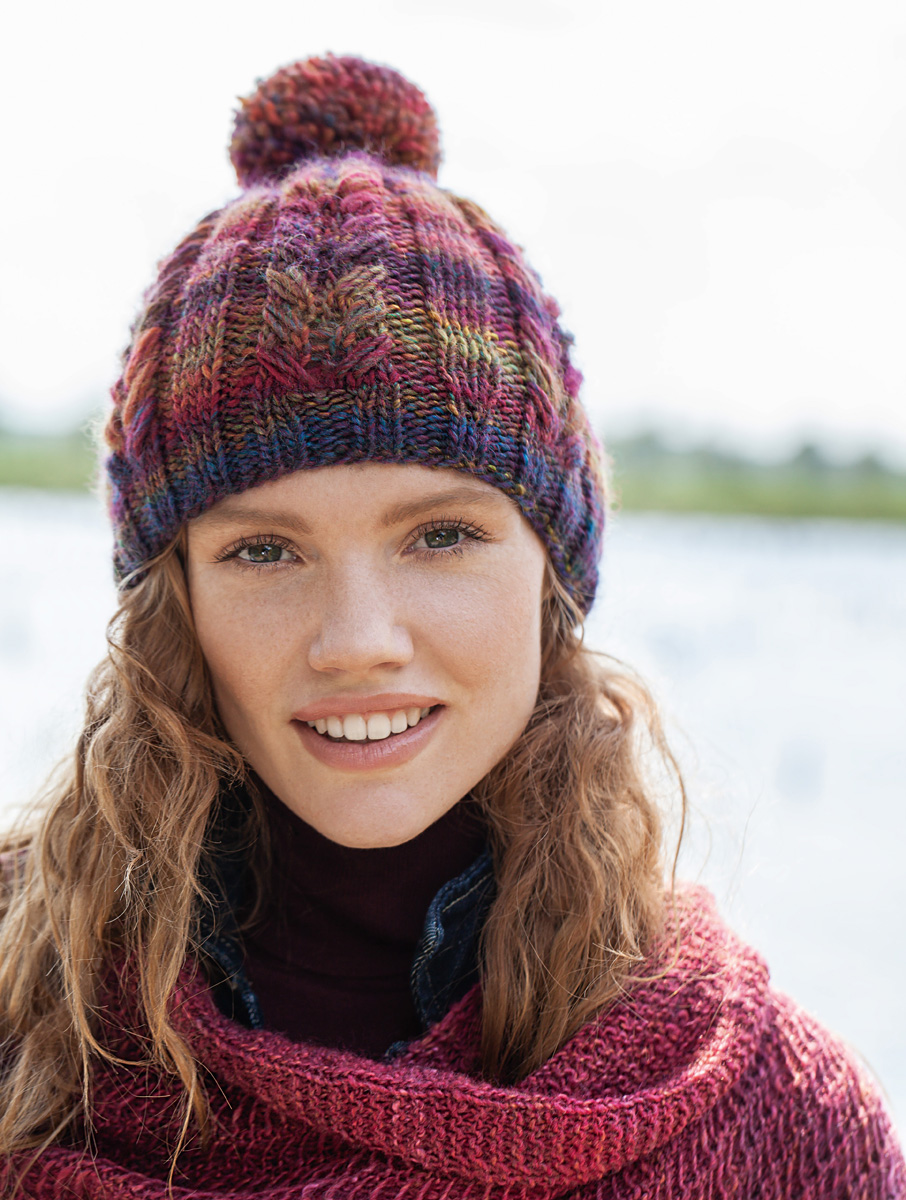 100 g of Lana Grossa Gomitolo Mezzo (50% pure wool, 50% acrylic; 90 m/50 g) in Bordeaux/Orange/Yellow- Green/Petrol/Corn (col 116). One set each size 4.5 and 5.5 mm double-pointed needles [dpns]; cable needle [cn]; pompom maker by LANA GROSSA