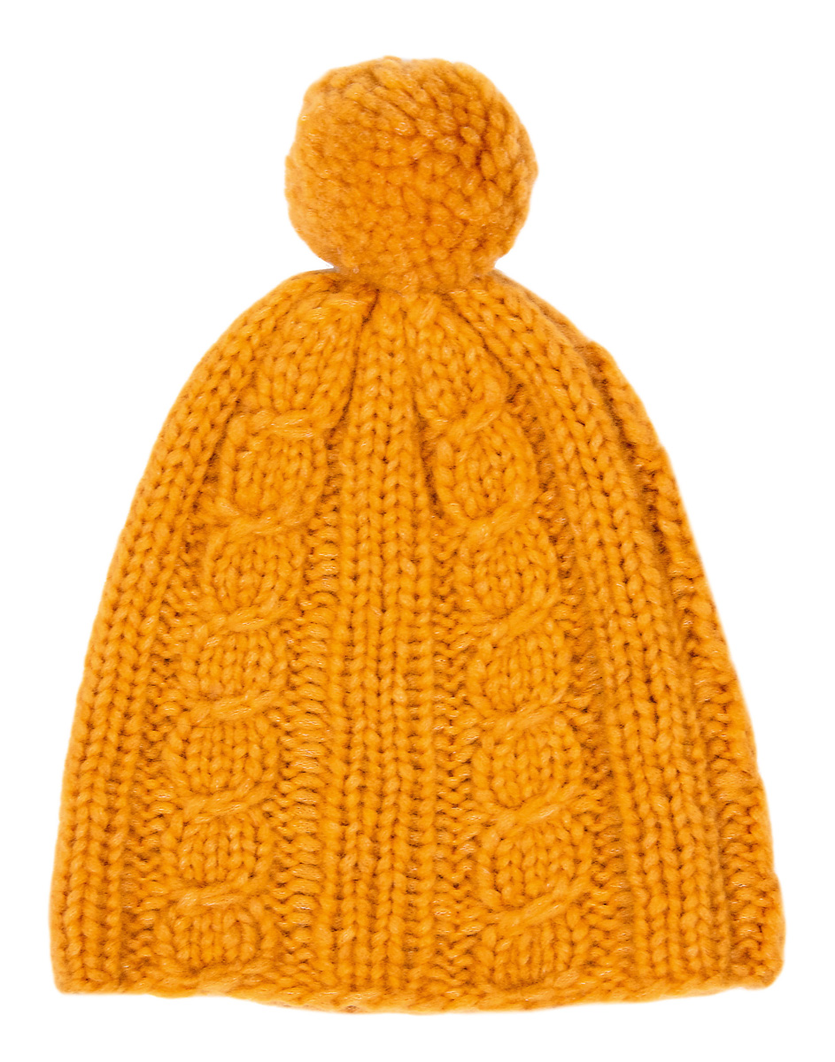 50 (75, 75) g of Lana Grossa Lala Berlin Lovely Cashmere (60% cashmere, 25% polyamide, 15% pure wool; 60 m/25 g) in Yolk (col 1). One set size 7 mm double-pointed needles [dpns]; cable needle [cn]; pompom maker.