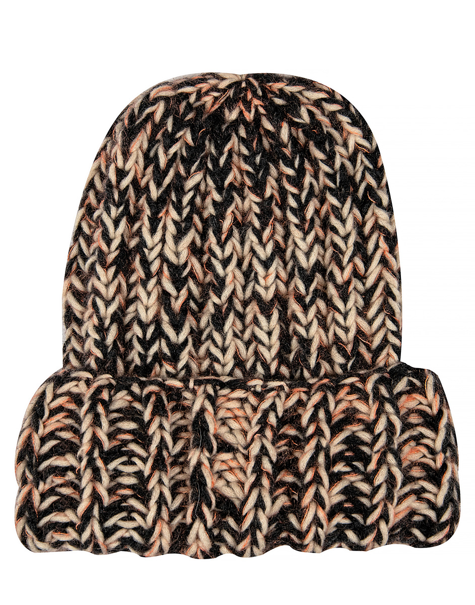 75 g of Lana Grossa Lala Berlin Lovely Cashmere (60% cashmere, 25% polyamide, 15% Merino wool; 60 m/25 g) in Charcoal (col 6); 100 g of Lana Grossa Lala Berlin Lovely Cotton (75% superfine Merino wool; 25% cotton; 75 m/50 g) in Natural (col 7); 25 g of Lana Grossa Silkhair (70% mohair, 30% silk; 210 m/25 g) in Salmon (col 130). One set size 10 mm double-pointed needles [dpns]; size 12 mm circular needle, 50 cm long