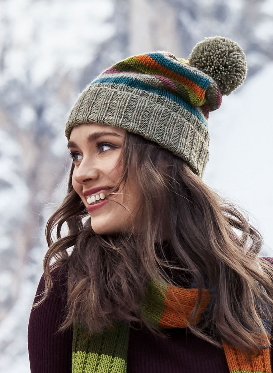 50 g each of Lana Grossa Merino Uno (100% superwash Merino wool; 125 m/50 g) in Light Grey (col 10), Mauve (col 17), Loden (col 20), Apple (col 21), Orange/Brown (col 15) and Dark Petrol (col 6). One set each size 3.5 and 4 mm double-pointed needles [dpns]; pompom maker