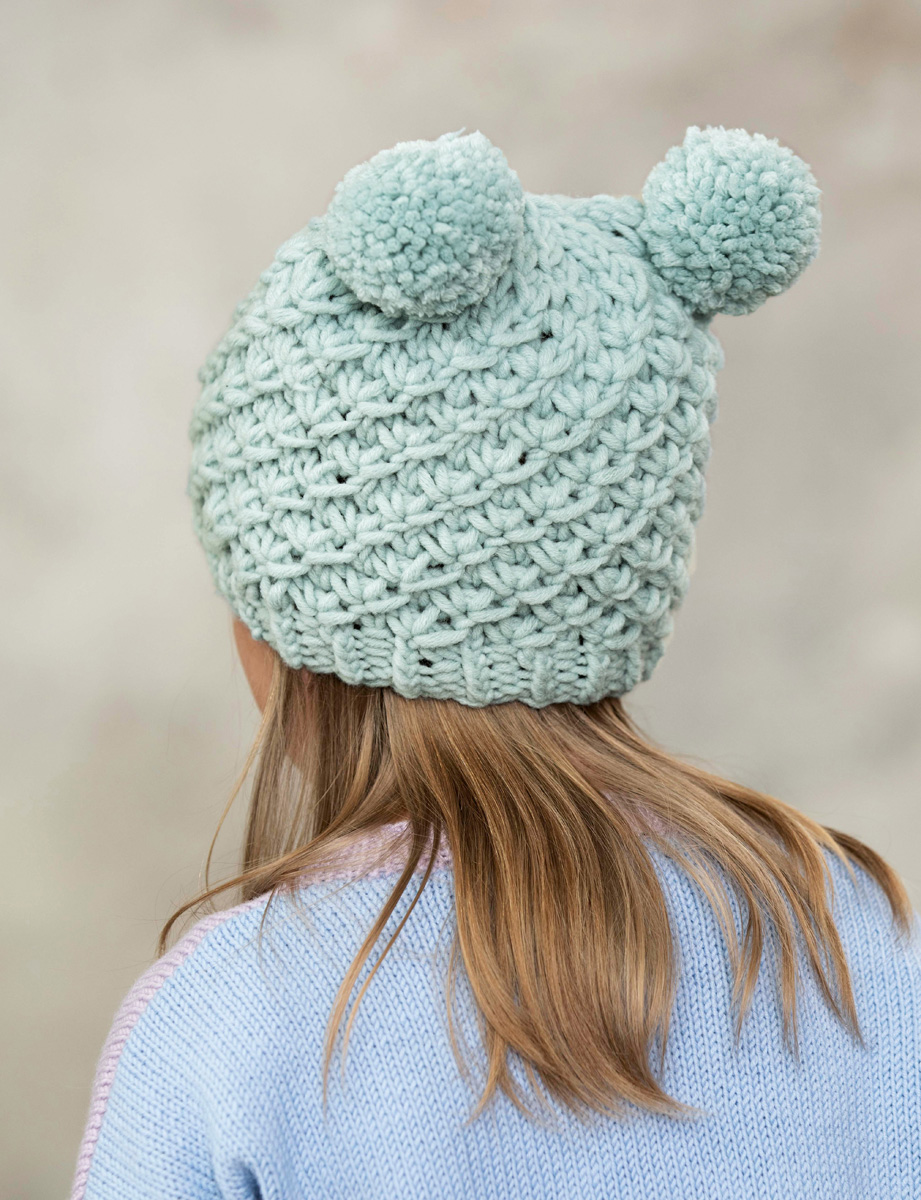 100 (150) g of Lana Grossa Mille II (50% extrafine Merino wool, 50% acrylic; 55 m/50 g) in Mint (col 86) or Light Jade (col 115) or Grey/Green (col 116) or Antique Pink (col 121) or Pale Purple (col 59) or Antique Violet (col 66). One set each size 7 and 8 mm double-pointed needles [dpns]; pompom maker by LANA GROSSA