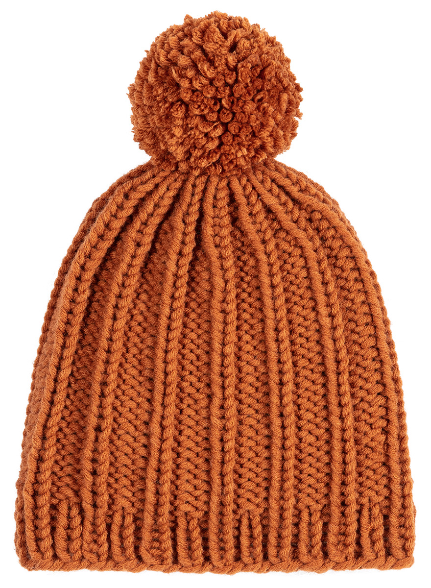 100 g of Lana Grossa Mille II (50% extrafine Merino wool, 50% acrylic; 55 m/50 g) in Caramel (col 143). Size 7 mm circular needle, 40 cm long; one set size 7 mm doublepointed needles [dpns]; pompom maker