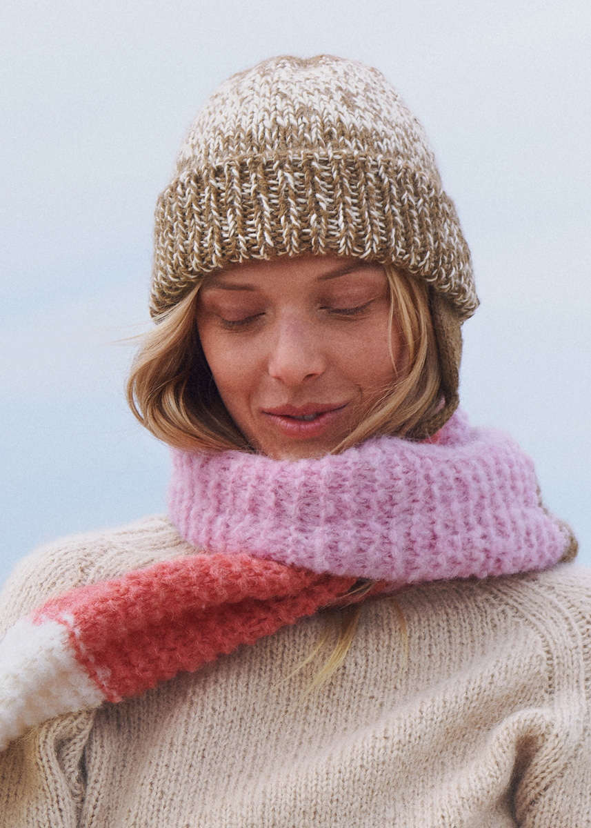100 g of Lana Grossa Natural Alpaca Classico (85% alpaca, 15% Merino wool; 125 m/50 g) in Nougat (col 107) and 50 g in Off White (col 101). Size 5 mm circular needle, 40 cm long; one set each size 3 and 5 mm double-pointed needles [dpns]; stitch markers