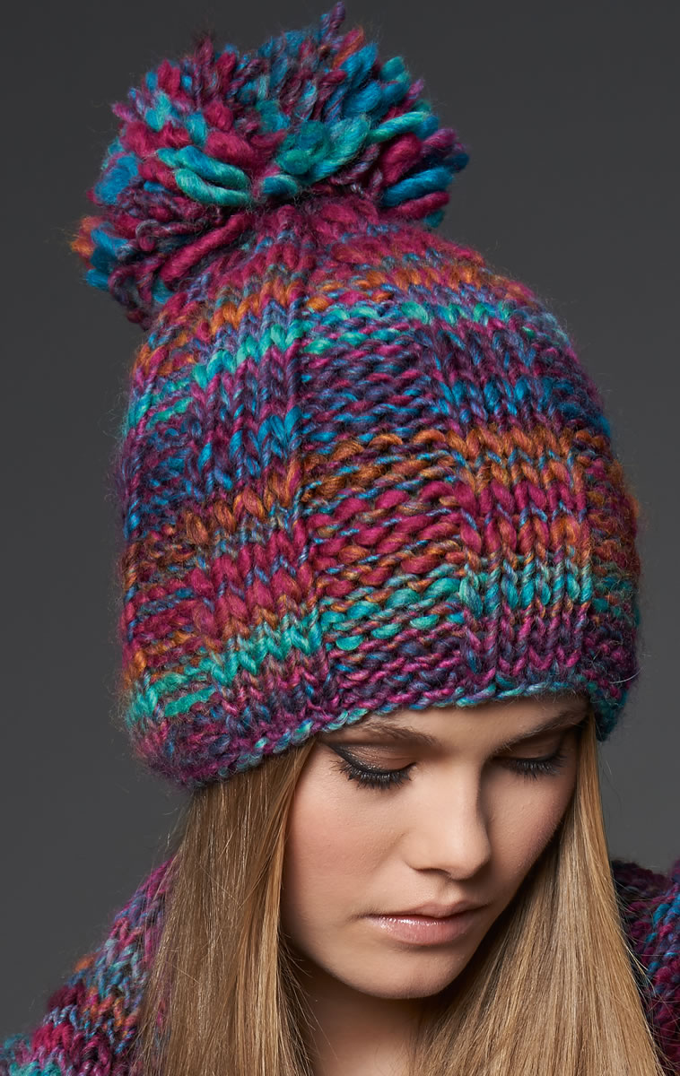 Lana Grossa Olympia Classic (53% wool, 47% acrylic; 100 g = 100 m) approx 100 g in Cyclamen/Bordeaux/Turquoise/Orange/Petrol (col 37); one set size 10 mm double-pointed needles [dpns]; size 6 mm crochet hook; pompom maker