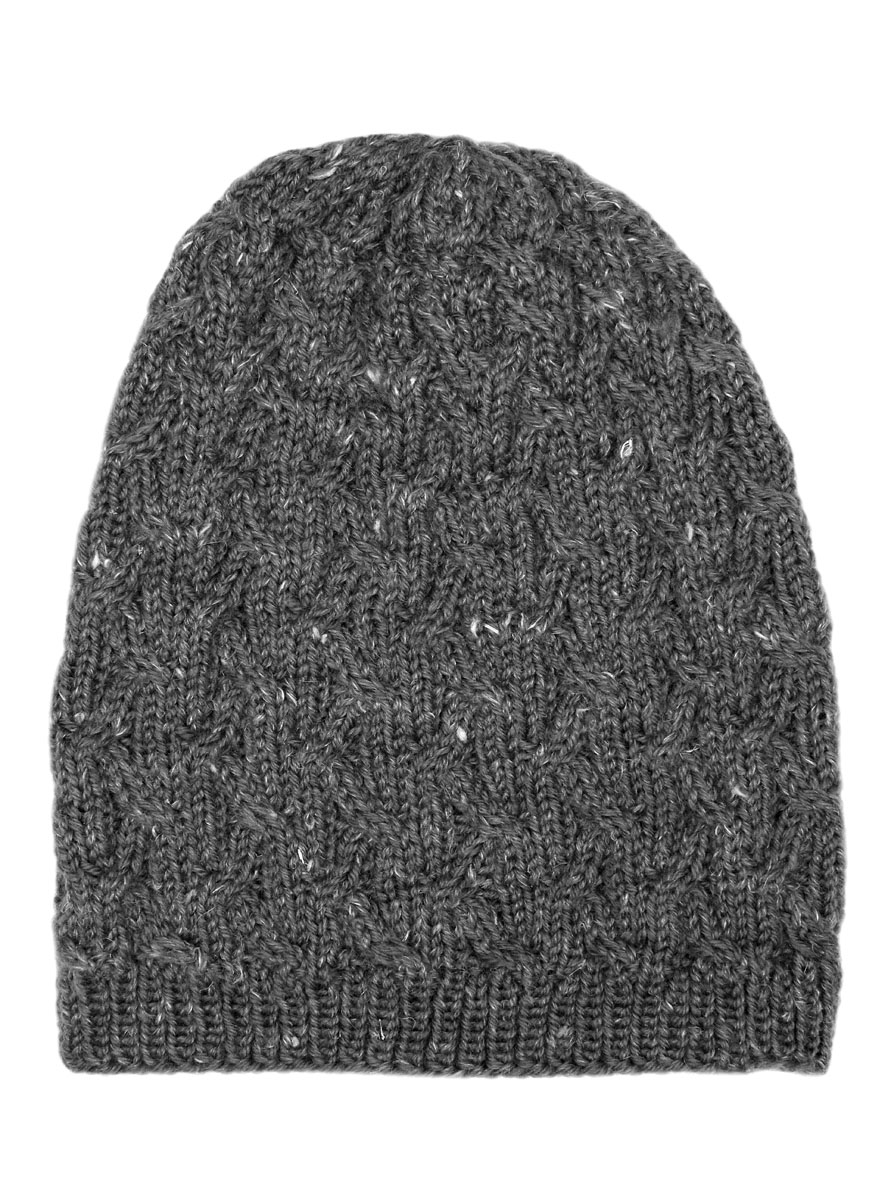 50 g of Lana Grossa Smokey (46% Merino wool, 41% cotton, 8% polyamide, 5% yak; 225 m/50 g) in Linen/Beige/Sand (col 206). One set each size 4 and 5 mm double-pointed needles [dpns]; cable needle [cn]