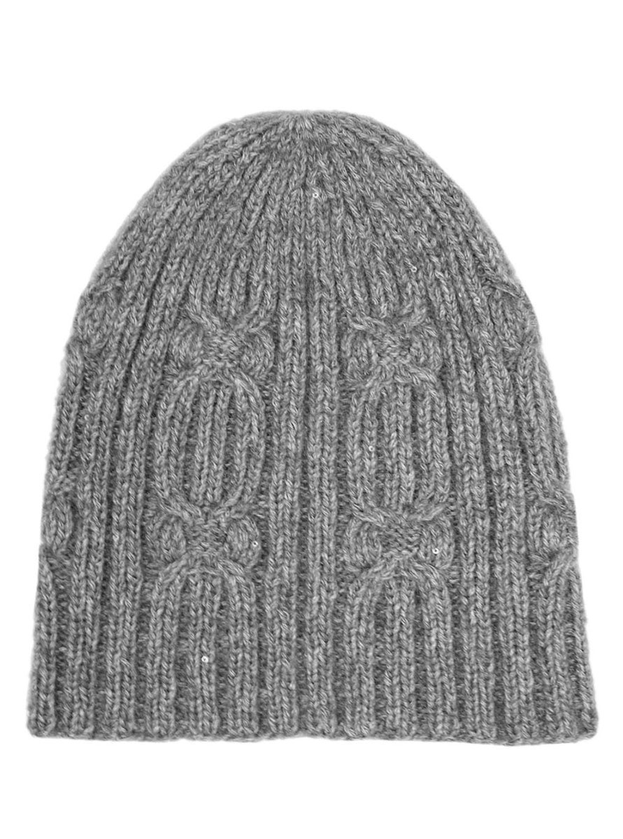 50 g of Lana Grossa Smokey (46% Merino wool, 41% cotton, 8% polyamide, 5% yak; 225 m/50 g) in Linen/Beige/Sand (col 206) and 25 g of Lana Grossa Silkhair Paillettes (61% superkid mohair, 17% polyamide, 11% Merino wool, 11% silk; 155 m/25 g) in Caramel (col 418). One set each size 4 and 5 mm double-pointed needles [dpns]; cable needle [cn].