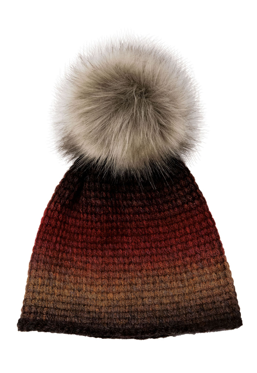 100 g of Lana Grossa Super Color (64% pure wool, 30% alpaca, 6% polyamide; 240 m/100 g) in Nougat/Dark Red/Grey-Brown/Mocha (col 107); faux fur pompom in black/beige (col 129); Size 8 mm tunisian crochet hook