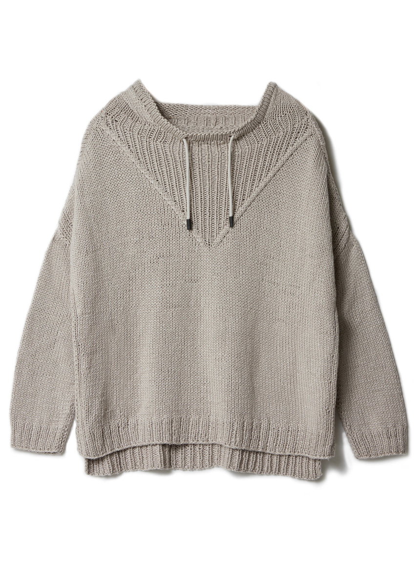 Lana Grossa “Puro Vegano” (65% cotton, 20% Tencel, 15% Polyamide, running length 90 m / 50 g): for the sweater 700 (800 - 850) g gray beige (color 2) 1 size 5 circular knitting needle, 80 cm long, 1 size 5 circular knitting needle, 40 - 60 cm long, set double pointed needles size 5, 1 cable or auxiliary needle, 2 stitch markers, 2 stitch holders, 110-120 cm long cord or shoelaces, wool needle; scissors