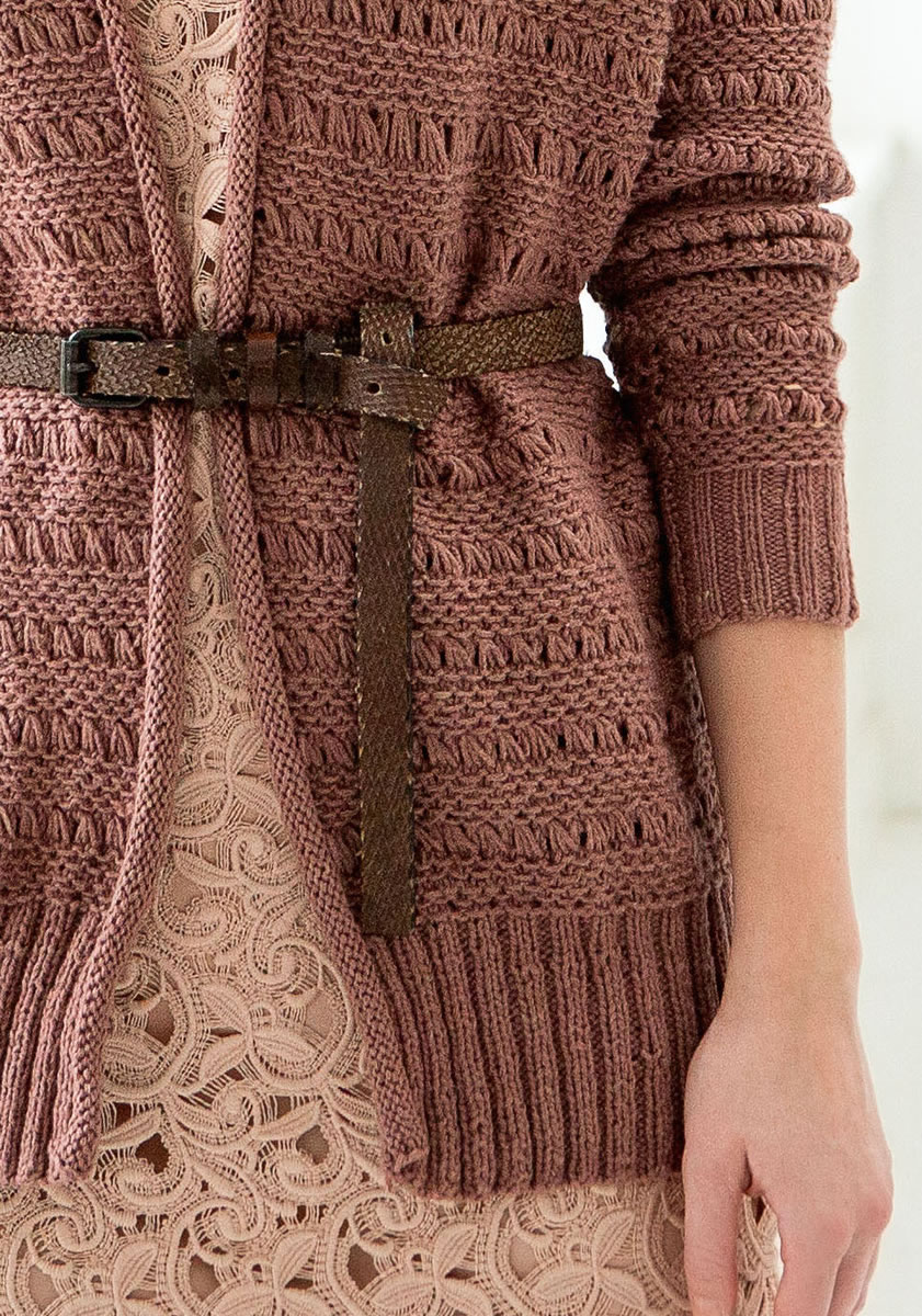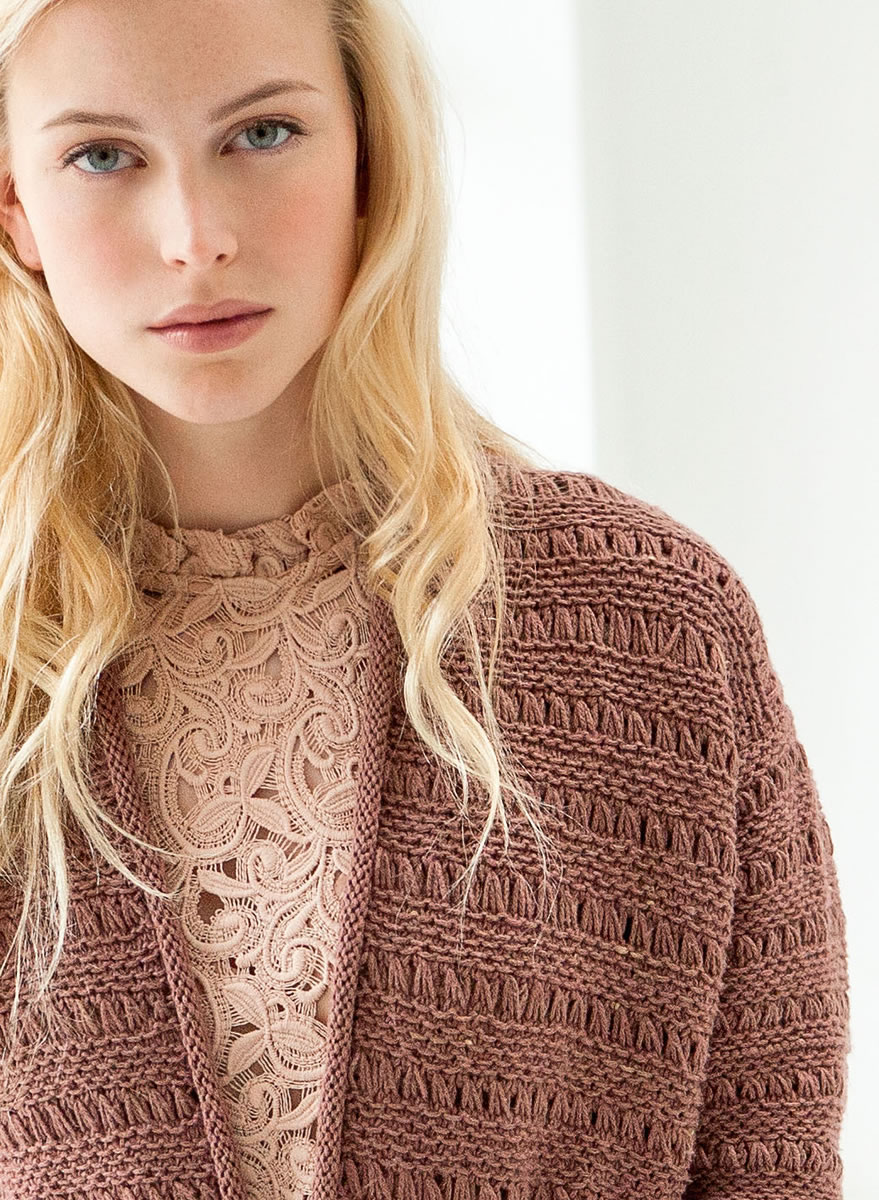 450 (500, 550) g of Lana Grossa 365 Cashmere (77% cotton, 15% cashmere, 8% polyamide; 175 m/50 g) in Nougat (col 19). Size 4 and 4.5 mm needles; size 4.5 mm circular needle, 100 cm long