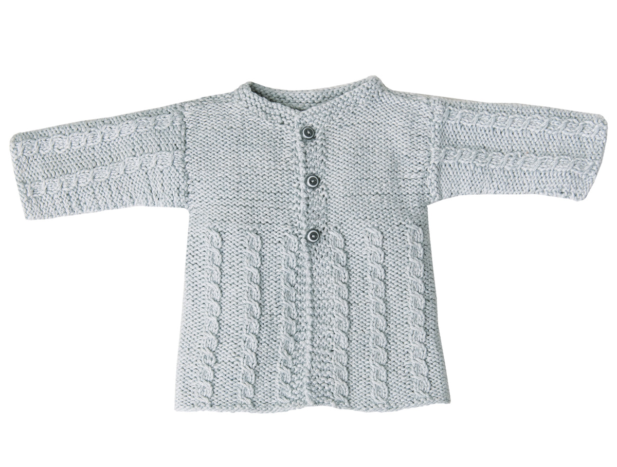 100 g of Lana Grossa 365 Cashmere (77% cotton, 15% cashmere, 8% polyamide; 175 m/50 g) in Silver Grey (col 6). Size 4 mm needles; size 4 mm circular needle, 40 cm long; cable needle [cn]; three 10 mm buttons