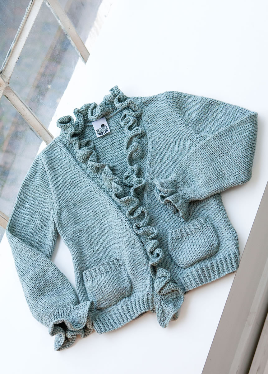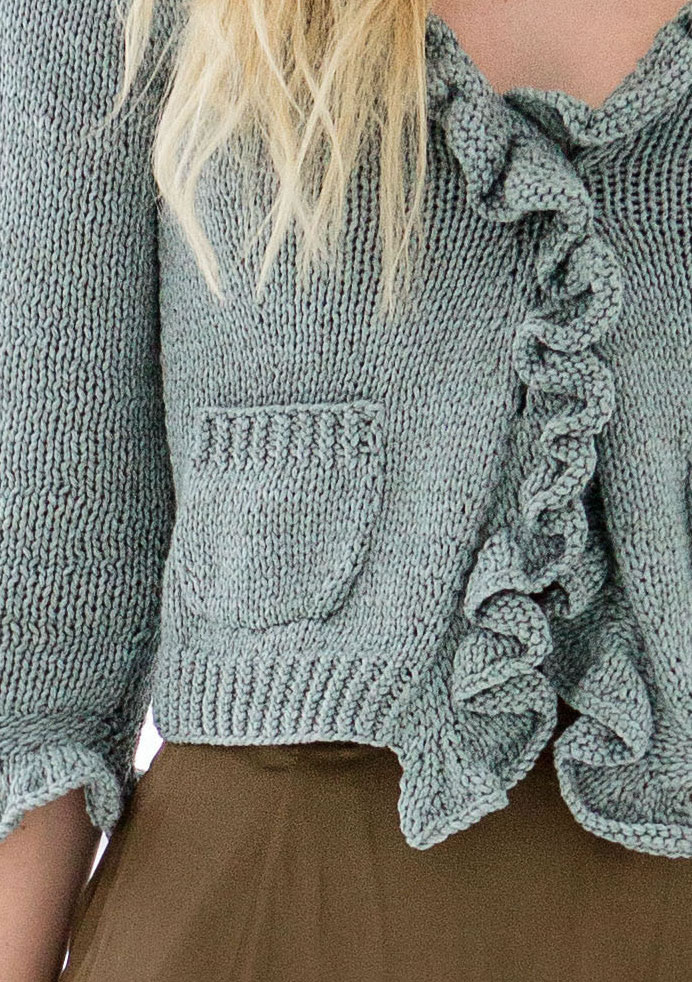300 (350, 400) g of Lana Grossa 365 Yak (66% cotton, 22% polyamide, 12% Yak; 145 m/50 g) in Mint/Grey (col 9). Size 5 and 6 mm needles; size 5 mm circular needle, 80 cm long; one button.