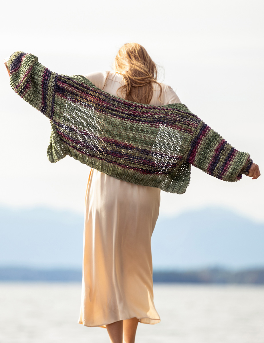 600 (650, 700) g of Lana Grossa About Berlin Bulky Print (50% cotton, 50% Micromodal; 47 m/50 g) in Reed/ Charcoal/Berry/Grey-Green (col 104). Size 9 and 10 mm needles; size 8 mm crochet hook