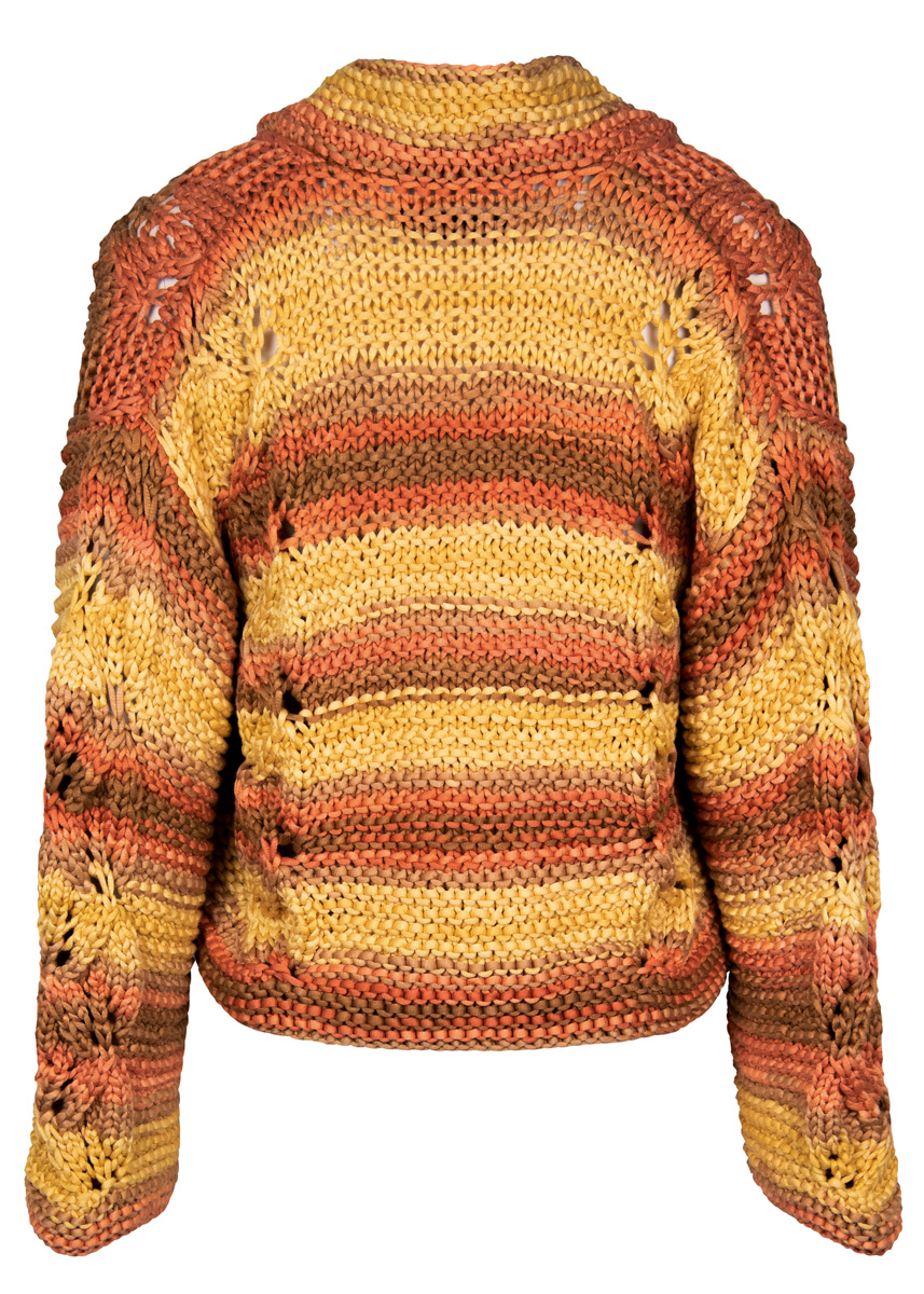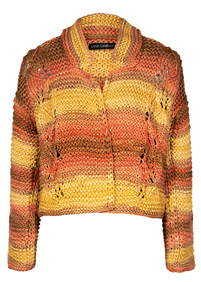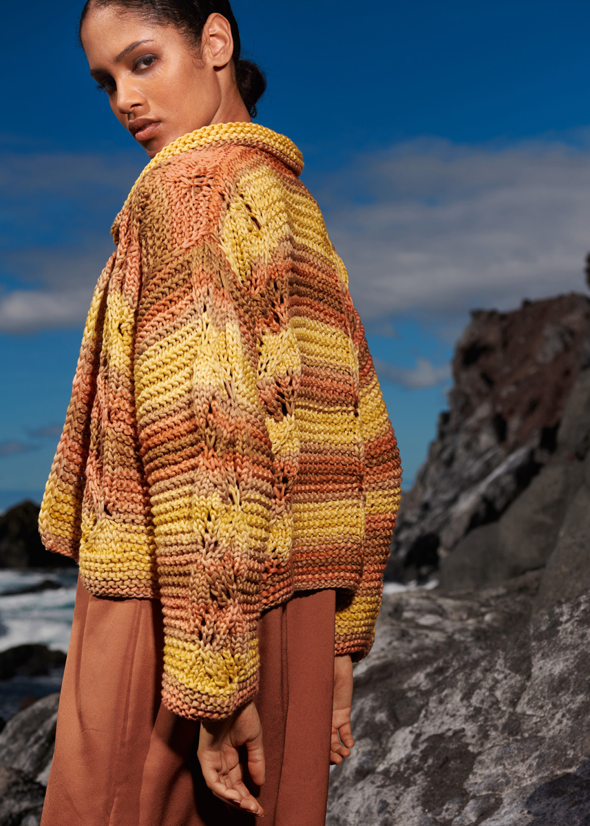 800 (850) g of Lana Grossa About Berlin Bulky Print (50% cotton, 50% Micromodal; 47 m/50 g) in Yellow/ Orange/Gold-Brown/Salmon (col 101). Size 8 and 9 mm needles