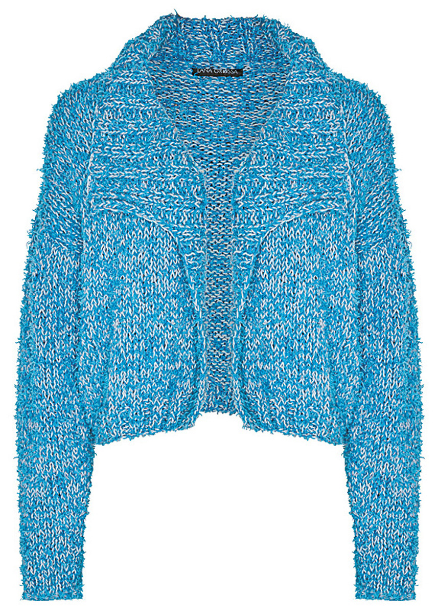 300 (350) g of Lana Grossa About Berlin Funky (83% cotton, 17% polyamide; 115 m/50 g) in Gentian Blue (col 11) and 350 (400) g of Lana Grossa Brigitte No. 4 (80% cotton, 20% baby alpaca; 110 m/50 g) in Grey/Blue (col 17). Size 5 and 7 mm needles; size 5 and 6 mm circular needles, each 100 cm long