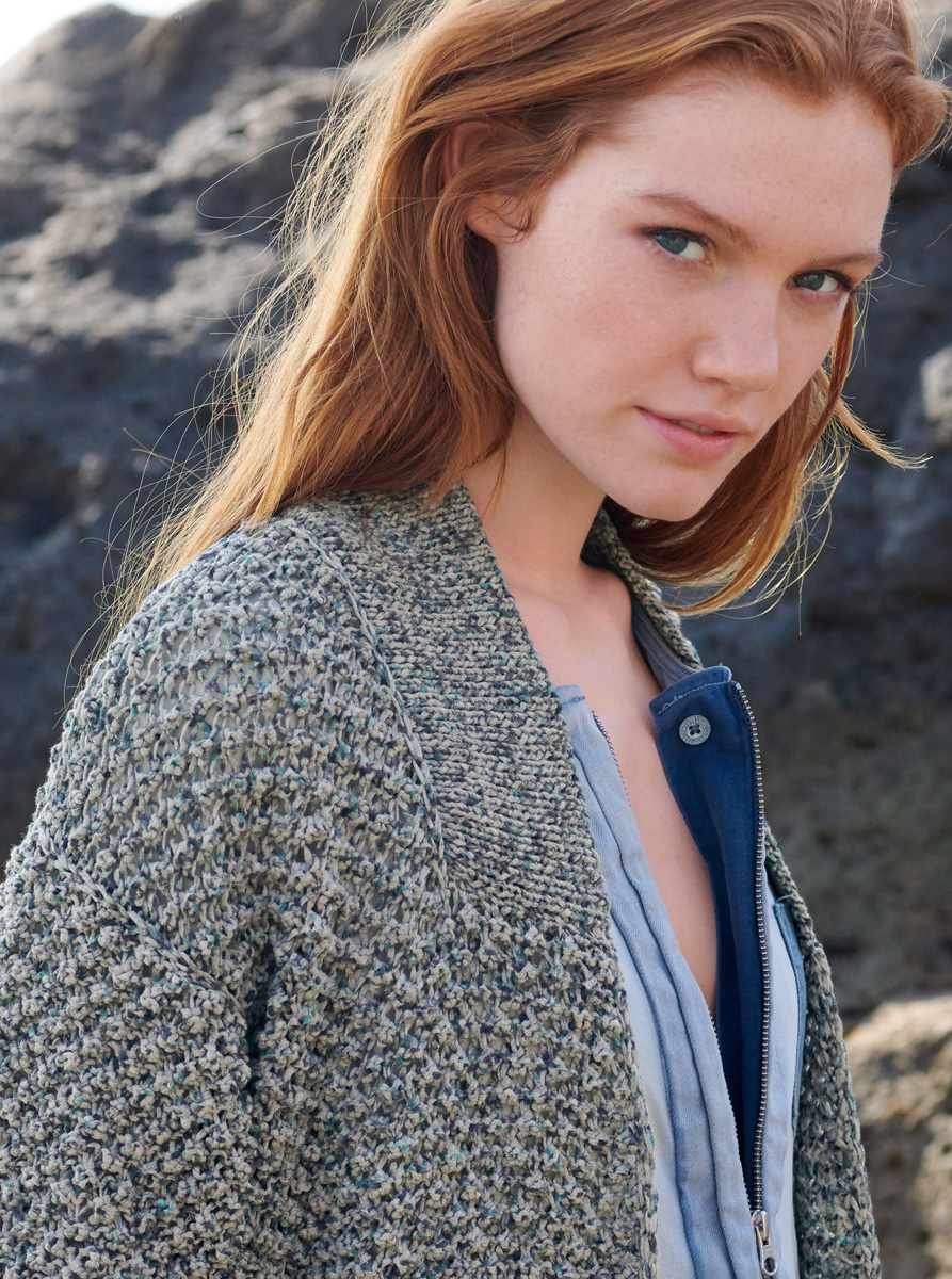 600 (650) g of Lana Grossa About Berlin Sparkly (82% cotton, 18% polyester; 120 m/50 g) in Grey/Petrol/Charcoal (col 10). Size 3 and 5 mm needles; size 3 mm circular needle, 80 cm long