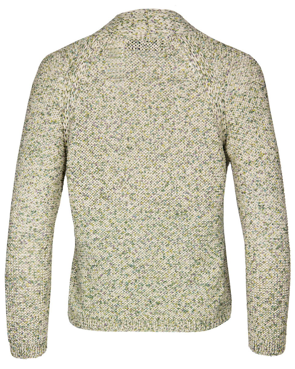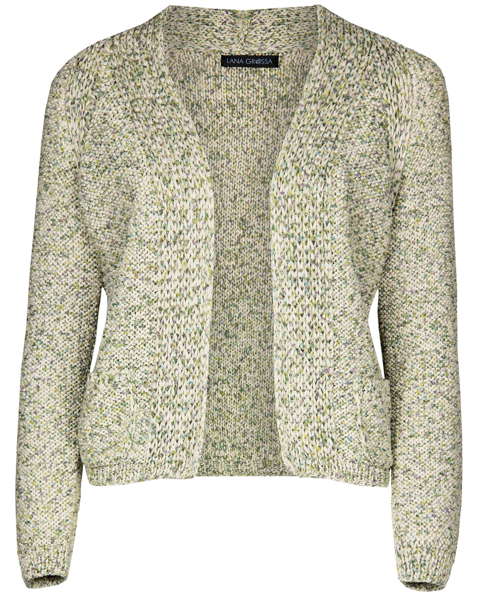 400 (450, 500) g of Lana Grossa About Berlin Sparkly (82% cotton, 18% polyester; 120 m/50 g) in Natural/ Purple/Yellow-Green/Petrol (col 12). Size 3 and 7 mm needles