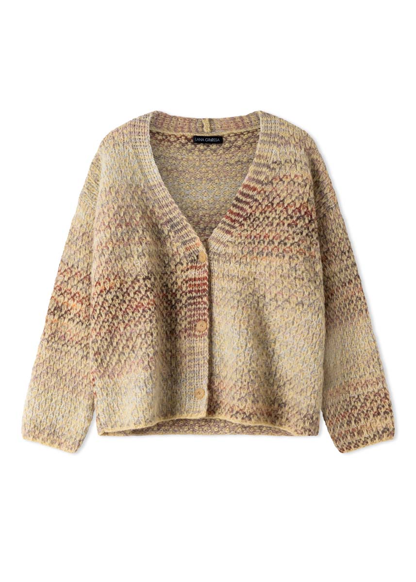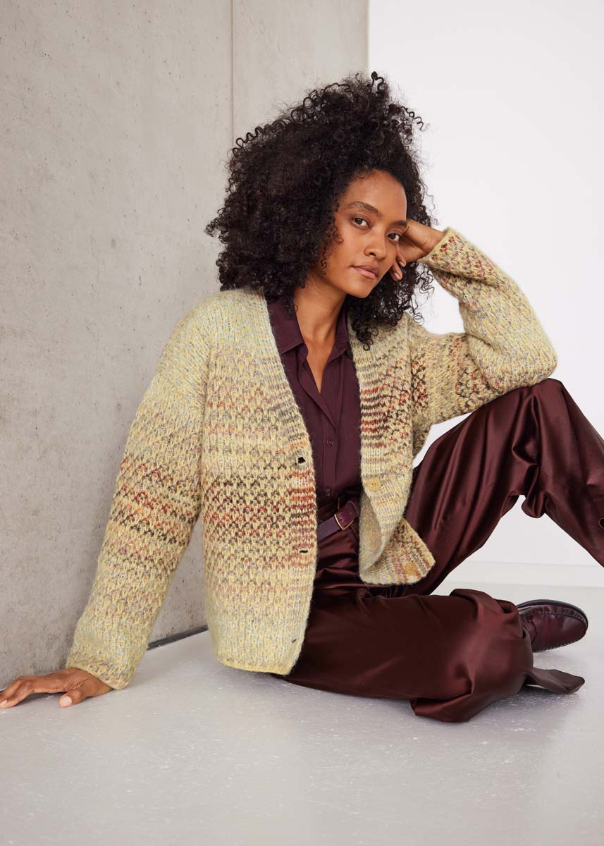 200 (250, 300) g of Lana Grossa Airy (42% baby alpaca, 40% cotton, 18% extrafine Merino wool; 170 m/50 g) in Vanilla (col 18); 150 (150, 200) g of Lana Grossa Picasso (36% extrafine Merino wool, 36% baby alpaca, 28% polyamide; 210 m/50 g) in Beige/Pink/Light Grey/White/Nougat/ Sand/Camel (col 17). Size 6 mm needles; 2 stitch holders; three 22 mm buttons.