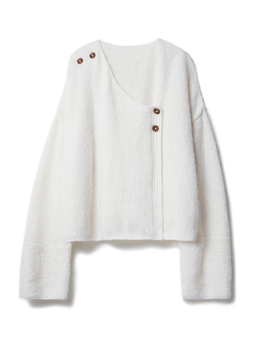 350 (400, 450, 500) g of Lana Grossa Alpaca Air (62% baby alpaca, 11% fine Merino wool, 27% polyamide; 140 m/50 g) in Off White (col 1). Size 5 mm needles; four 22 mm buttons in brown.