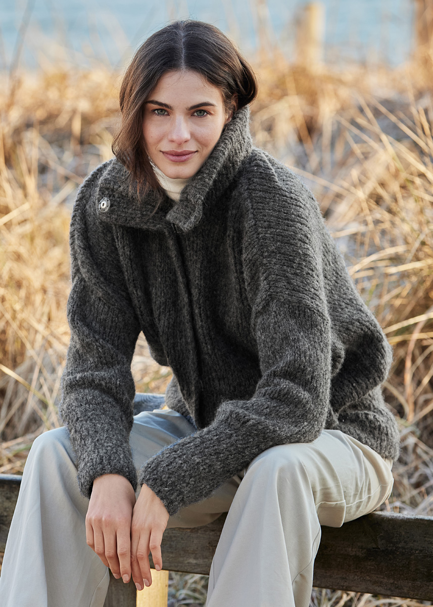 450 (450, 500, 500) g of Lana Grossa Alpaca Moda (74% baby alpaca, 13% Merino wool; 13% polyamide; 135 m/50 g) in Charcoal (col 5). Size 4 and 7 mm needles; size 4 mm circular needle, 40 cm long; six 25 mm snap buttons in dark grey