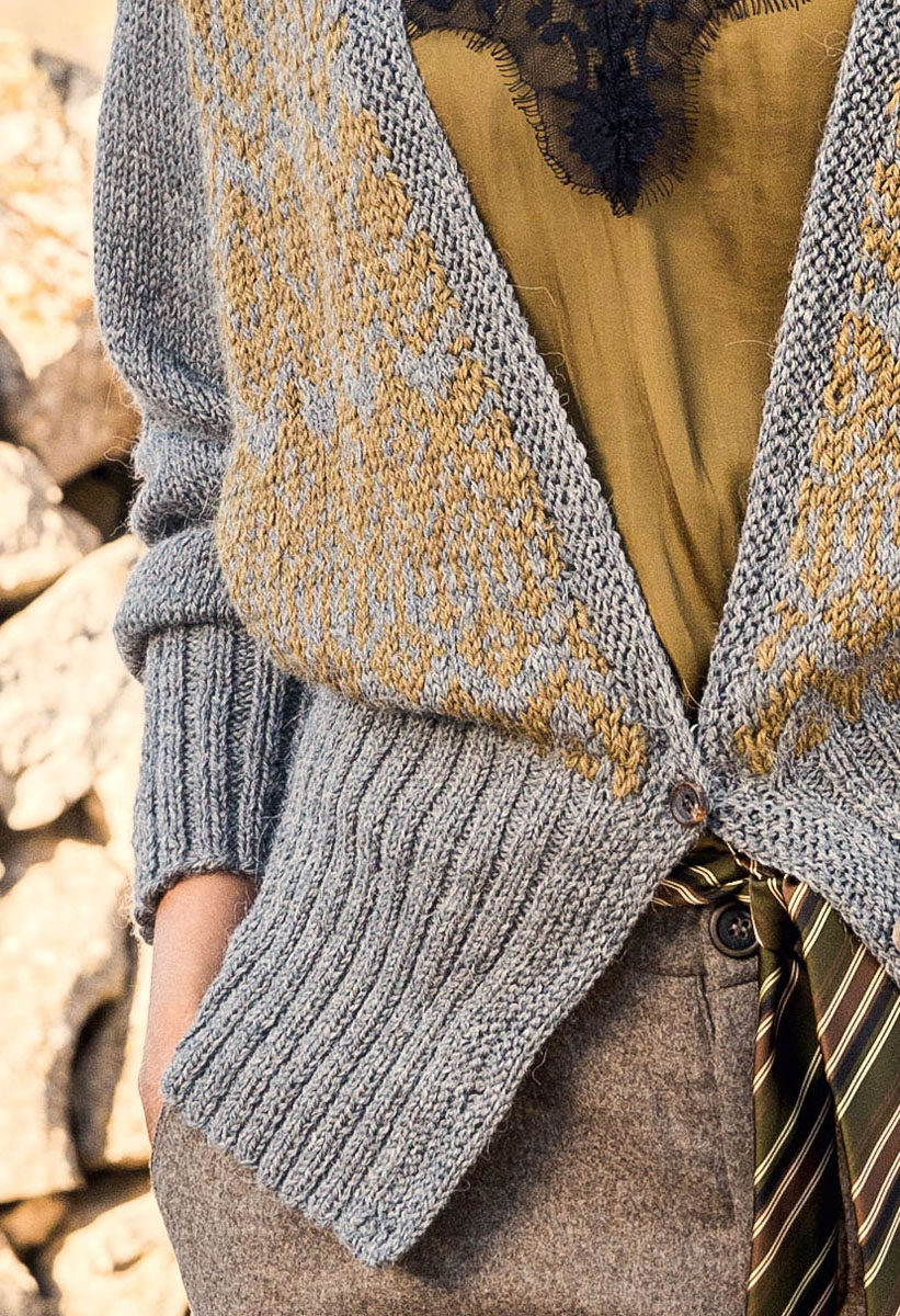 350 (400, 450) g of Lana Grossa Alpaca Peru 100 (100% alpaca; 100 m/50 g) in Dark Grey (col 117) and 100 (100, 150) g in Olive (col 113). Size 3.5 and 4.5 mm needles; size 4 mm circular needle, 120 cm long; four 15 mm buttons